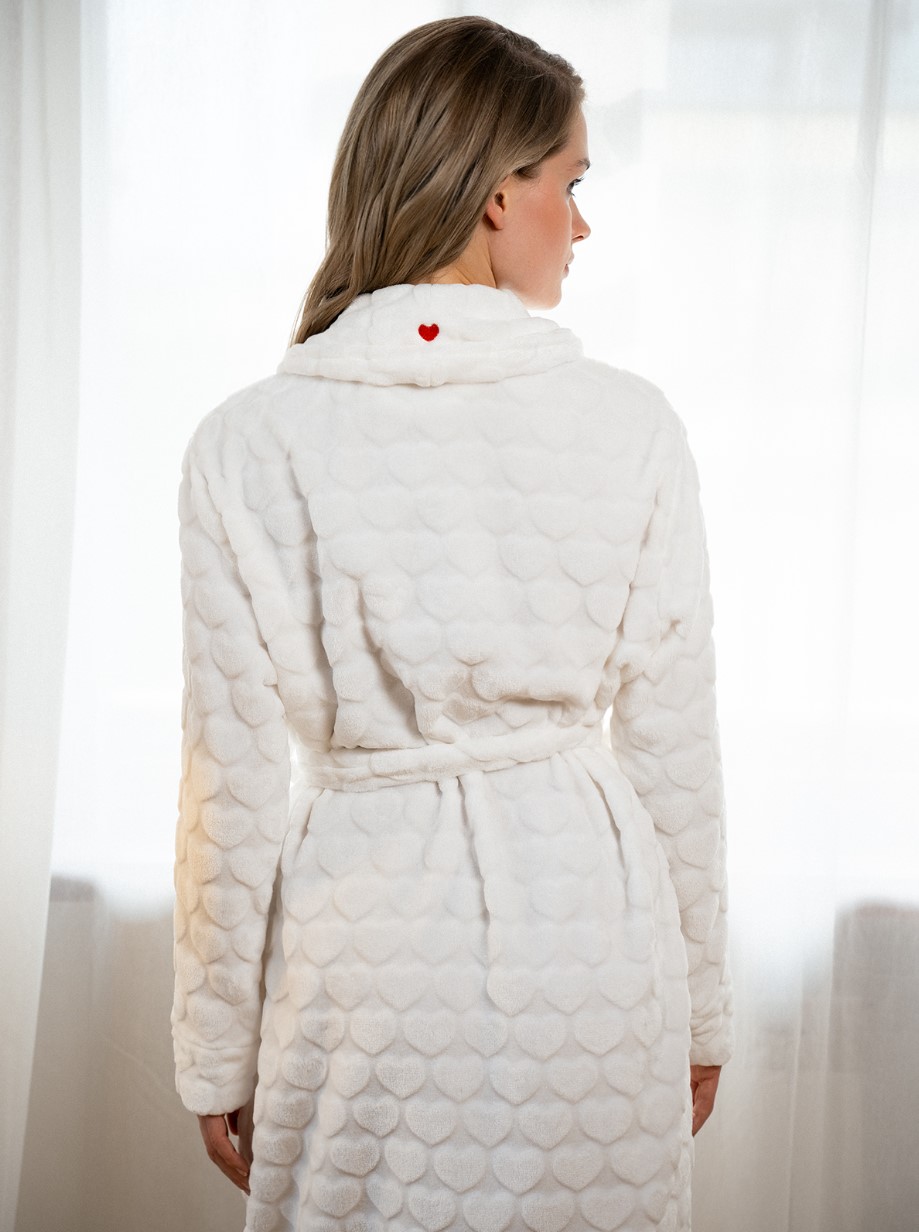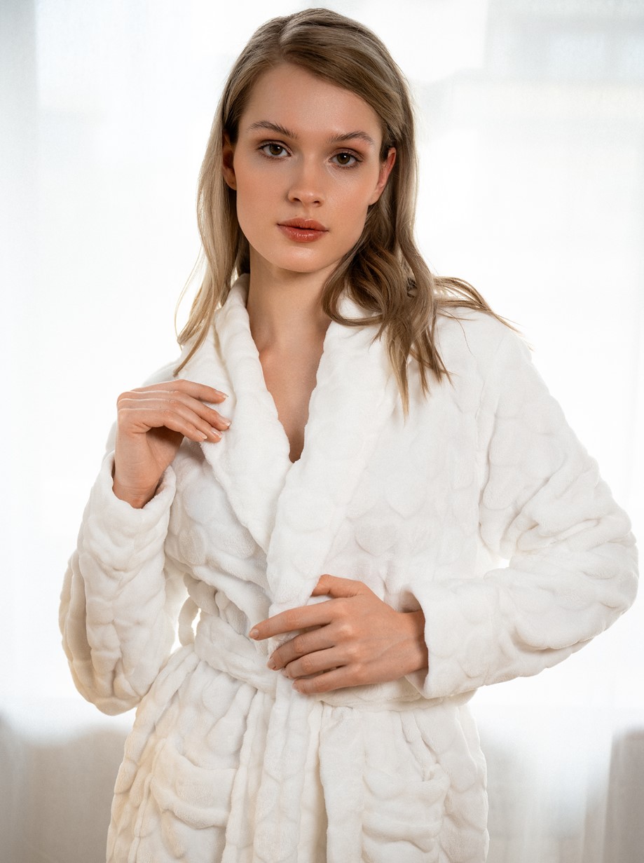 Мягкий белый халат 5178SYC от бренда indefini выполнен из приятного на ощупь и легкого материала.