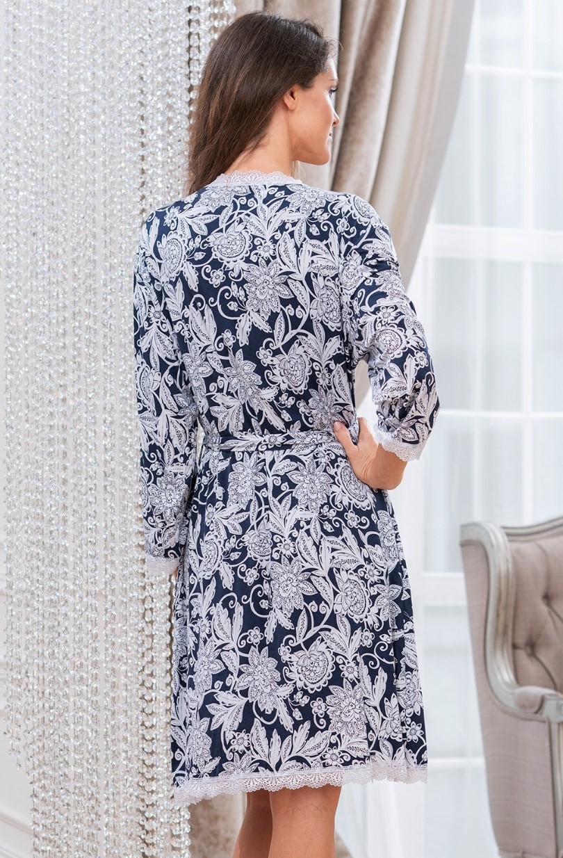 Короткий халат Mia-Mella выполнен из принтованного трикотажного полотна. Низ рукавов, борт и ворот халата декорированы белым кружевом. Халат на запах с поясом, со скругленными уголками по низу и карманами в боковых швах.