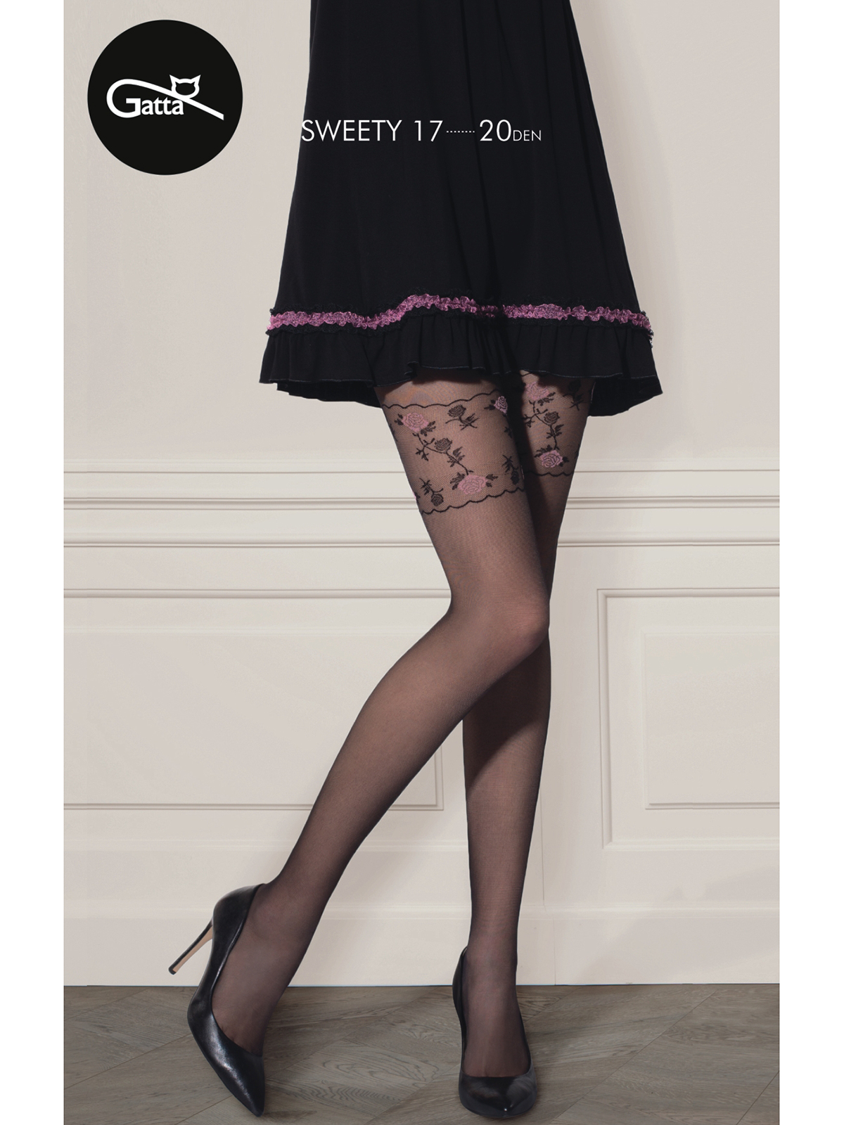 Тонкие фантазийные колготки с лайкрой, плотностью 20 ден, с широким комфортным поясом, ластовицей и усиленными плоскими швами. На нижней части модели размещена имитация прозрачных чулок с тканым узором "розы" на коронке.