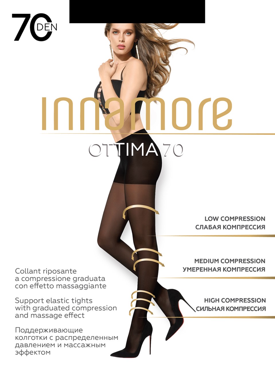 Матовые полупрозрачные колготки плотностью 70 ден с поддерживающими фигуру штаниками, распределенным давлением по ноге, создающим эффект легкого массажа и позволяющего снимать усталость ног, прозрачным незаметным усиленным мыском и анатомической ластовицей.