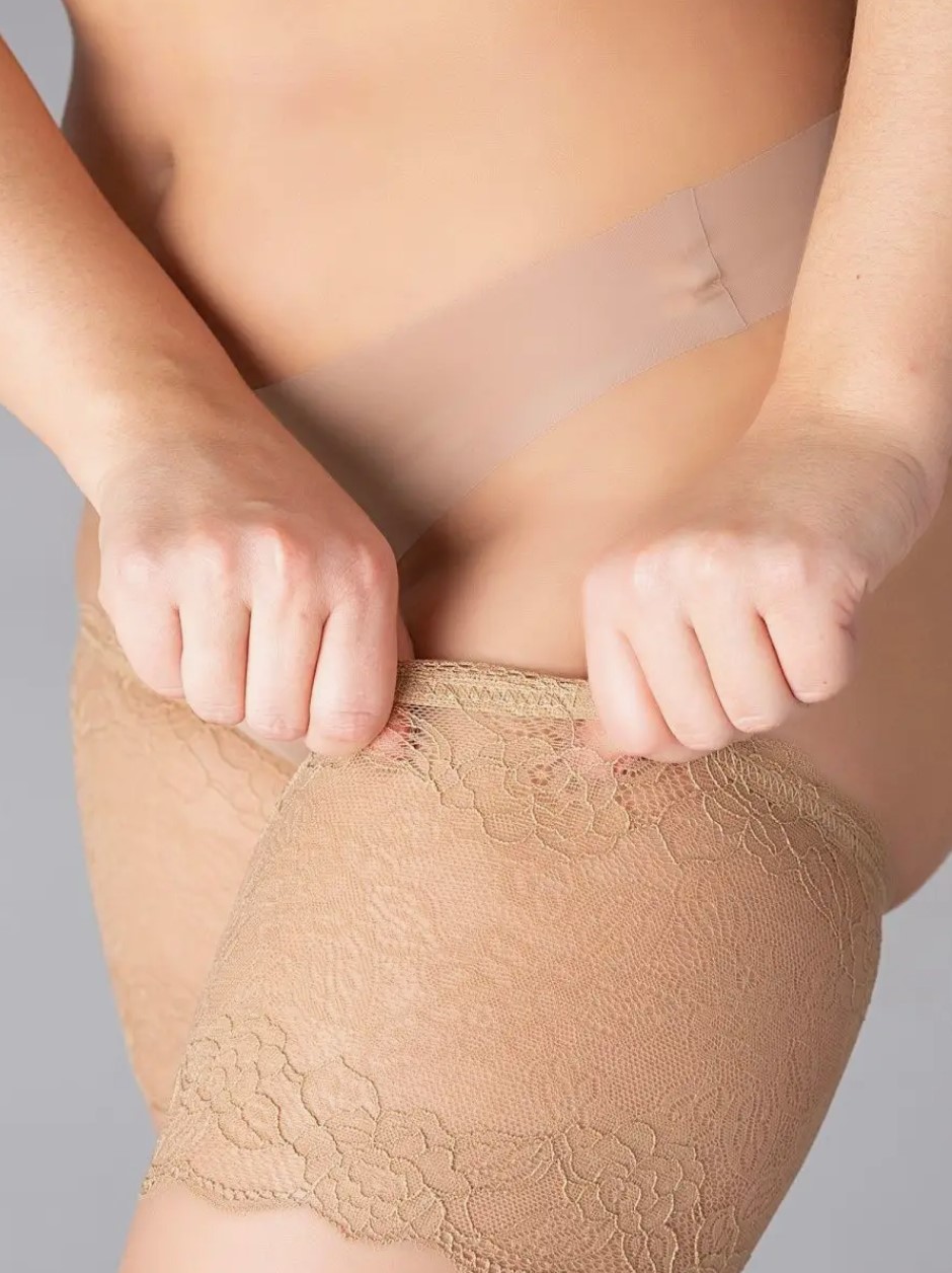 Стильный и функциональный аксессуар для защиты бёдер от натирания и появления раздражения в жаркую погоду. Элегантная полоска кружева шириной 17 см на силиконовой основе превосходно облегает и надежно фиксируется на ноге, создавая изящный барьер, который защищает нежную кожу от трения при ходьбе и выглядит как оригинальное украшение. Это отличная альтернатива, которая позволит отказаться от брюк, колготок и панталон в жаркую погоду.