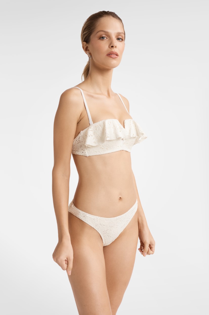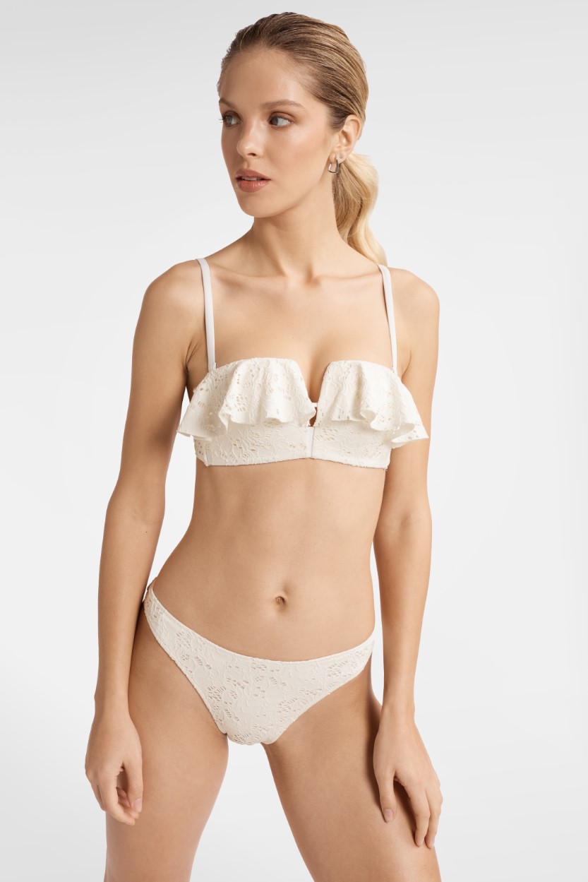 Топ-бикини Folklore push-up - это нежный бюстгальтер с мягкой подкладкой, который приподнимает и формирует грудь. Бюст также визуально увеличивается за счет оборки, украшающей вырез. Чашечки этого пляжного бюстгальтера пуш-ап Folklore кремового цвета обтянуты модной тканью, напоминающей вязаное крючком кружево.Плавки-бикини Folklore выполнены в классическом стиле нейтрального кремового оттенка. Они изготовлены из эластичной ткани, которая идеально подходит для любого типа фигуры. Эти эластичные пляжные плавки обтянуты модной вязаной тканью, напоминающей кружево ручной работы.