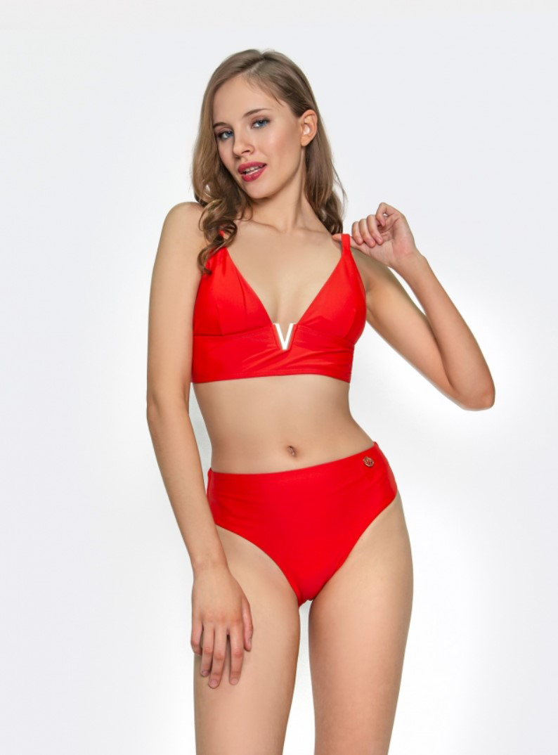 Раздельный купальник от торговой марки Индефини. В комплекте бюстгальтер и плавки. Бюстгальтер из полиамида, красного цвета, без косточек и без Push-up, со съемными подкладками, с небольшим вырезом, с декоративной вставкой, на тонких регулируемых лямках, с металлической застежкой. Плавки из полиамида, красного цвета, с декоративной вставкой, на мягкой резинке.