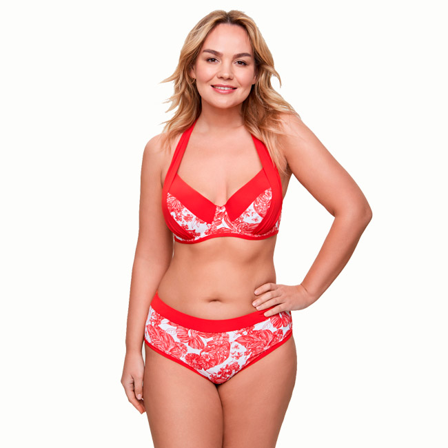 Раздельный женский купальник выполнен из эластичного полотна красного цвета с набивным тематическим принтом. Бюстгальтер формы T-Shirt без "Push-up". Чашки декорированы отлетной деталью, переходящей в бретели на шее. Трусики с высокой талией.
