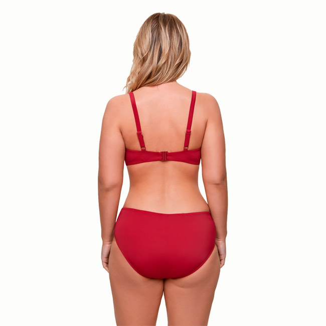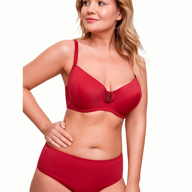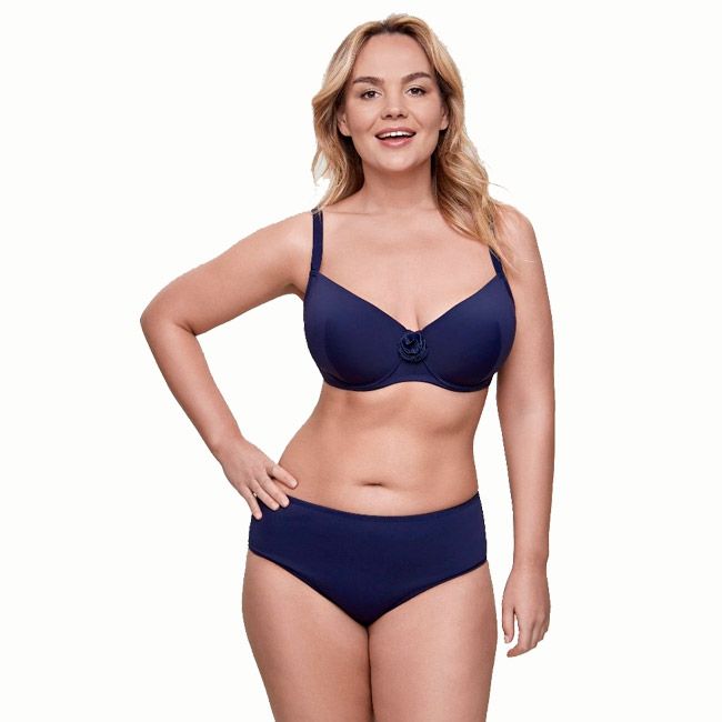 Раздельный женский купальник выполнен из эластичного однотонного полотна бордового или темно-синего цвета. Бюстгальтер формы T-Shirt без Push-up, на тонком поролоне и на косточках, декорирован тканевой розой. Несъемные, регулируемые по длине бретели. Трусики классической формы с высокой линией талии. При заказе через интернет-магазин указывайте цвет изделия.