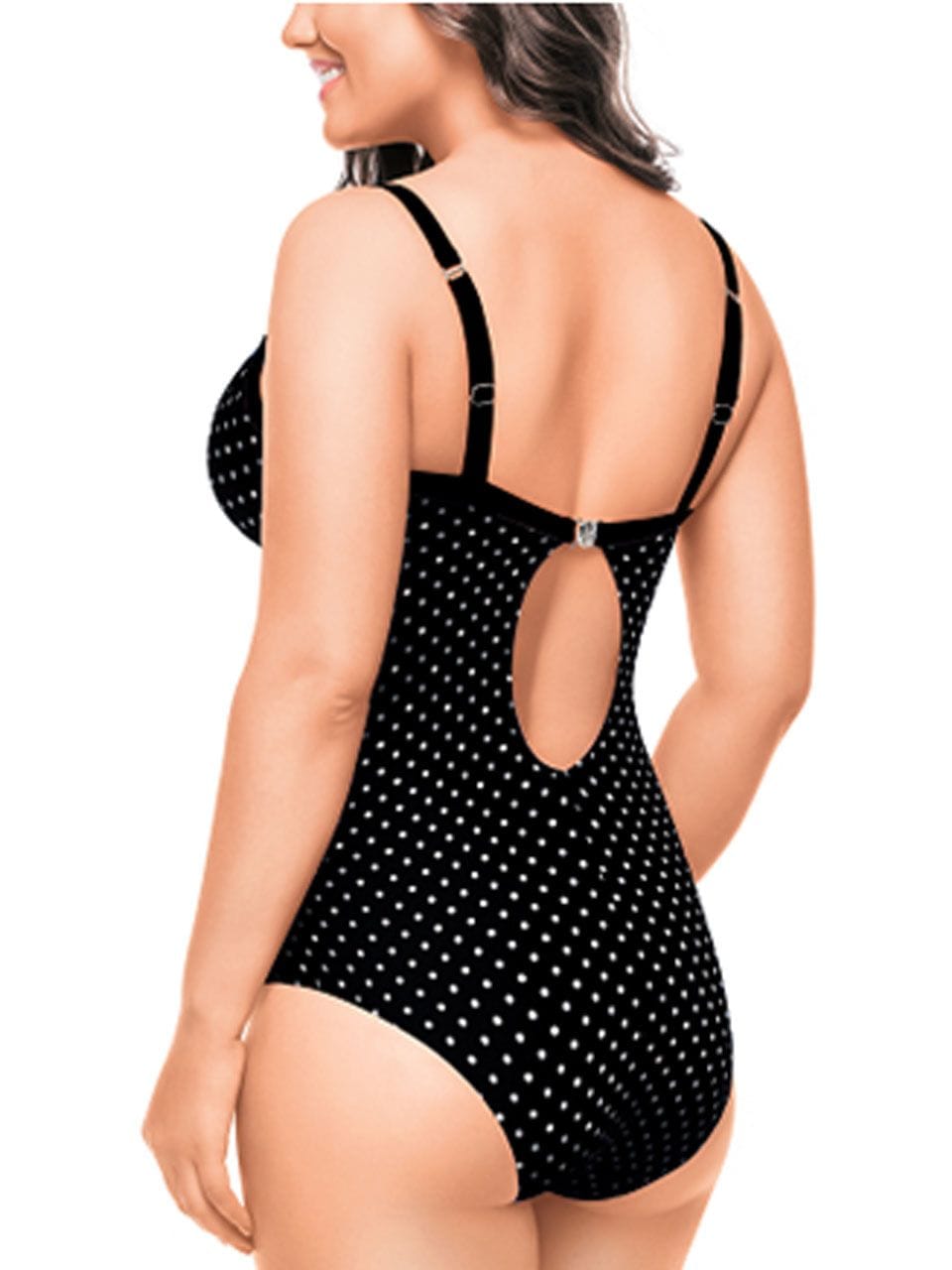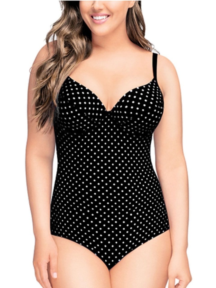 Чёрный слитный женский купальник в горошек. Формованная чашка с драпировкой визуально увеличивает объём груди.