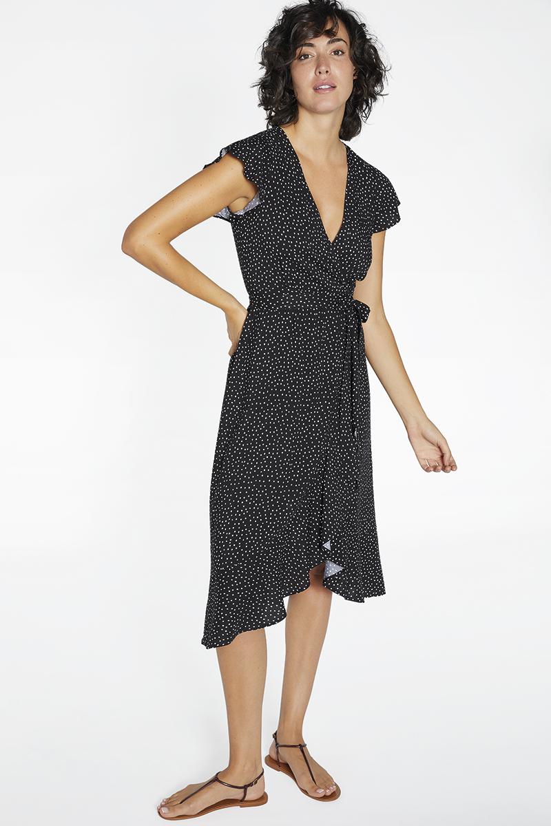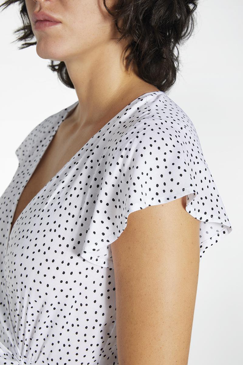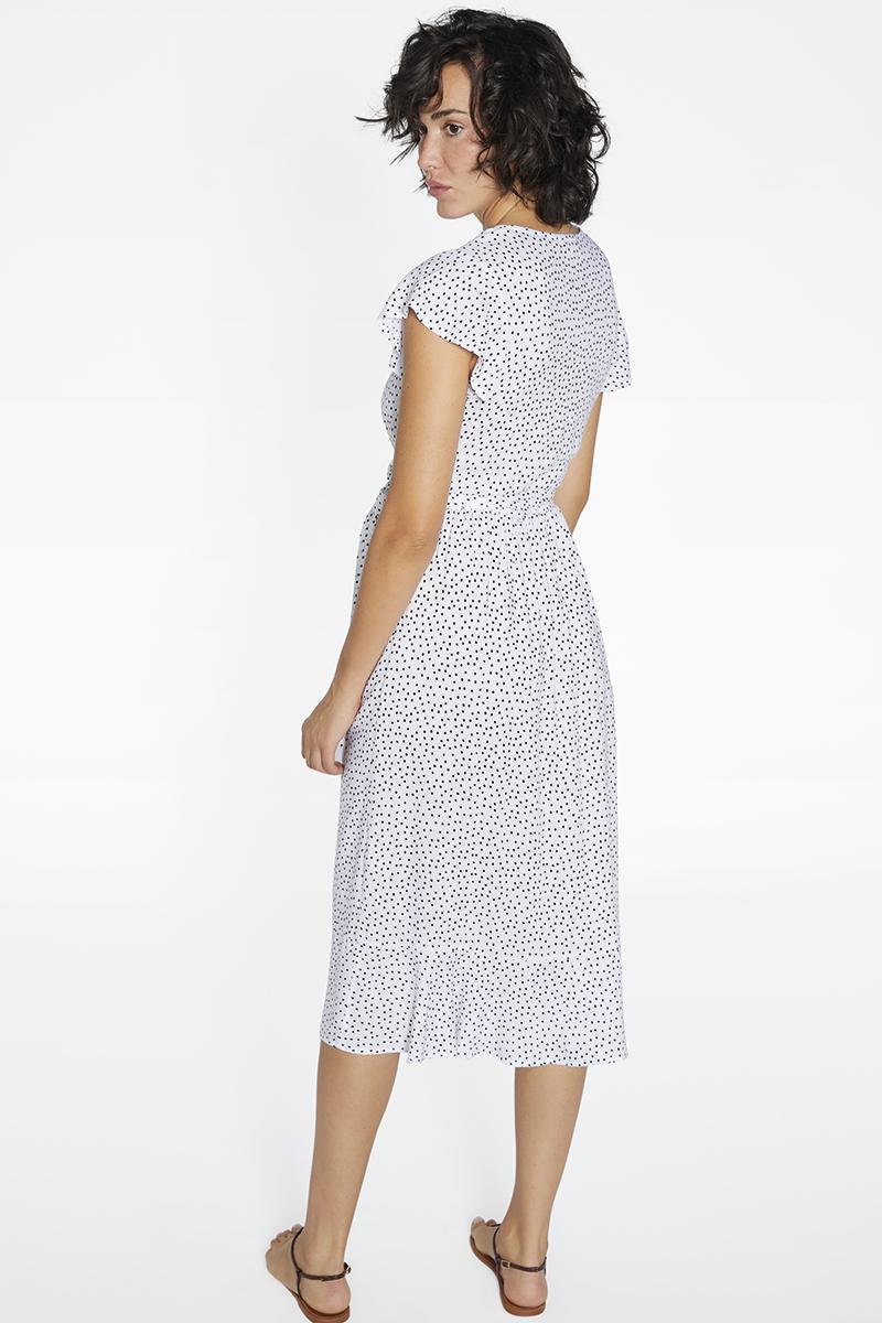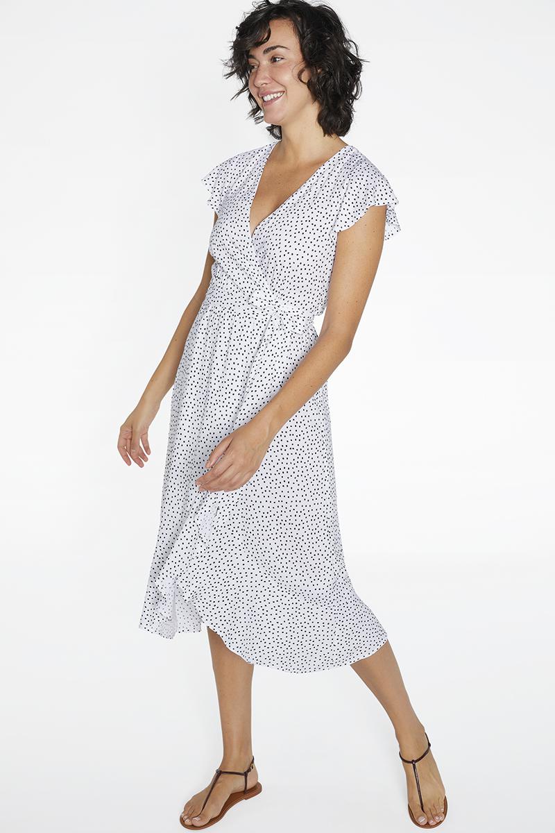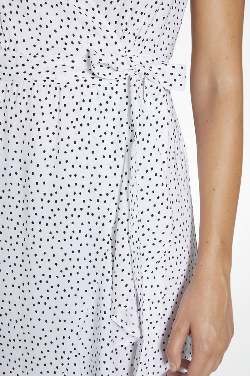 Пляжное платье 85718 от европейского производителя Ysabel Mora, принт в мелкую точку. Нежный вискозный материал, изделие удлиненное, на запахе, с воланами по краям.