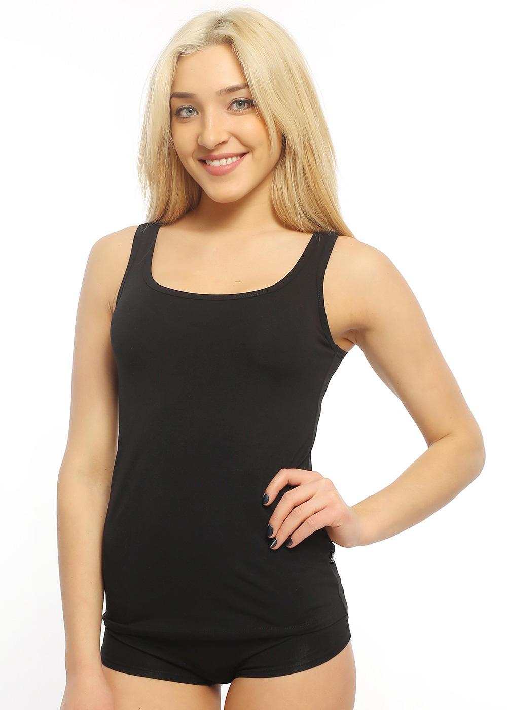 Майка женская выполнена из трикотажного однотонного хлопка. Майка на широких бретелях, приталенного силуэта, горловина круглая.