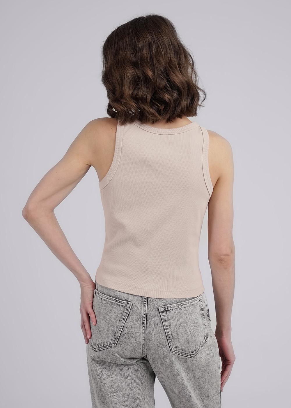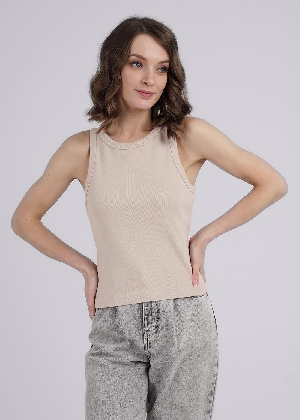 Майка из хлопкового трикотажного полотна кашкорсе. Умеренный объем. Узкая бретель, округлая горловина. По горловине и пройме окантовка. Производство Узбекистан.