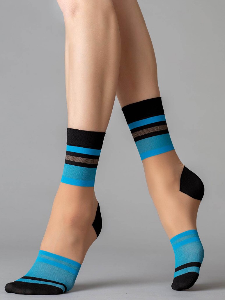 Эластичные фантазийные носки с укрепленным мыском, комфортной резинкой и имитацией пятки. Модель декорирована ярким геометрическим рисунком "горизонтальные полоски".