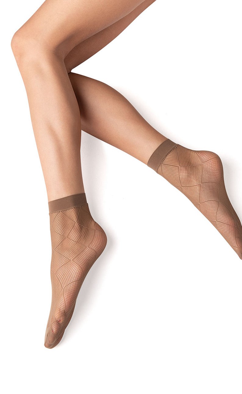 Женские фантазийные носки в сетку с рисунком ромб. Широкая удобная резинка и укрепленный мысок создают дополнительный комфорт. Благодаря особенностям плетения, носочки менее подвержены появлению затяжек и дольше сохраняют прочность.