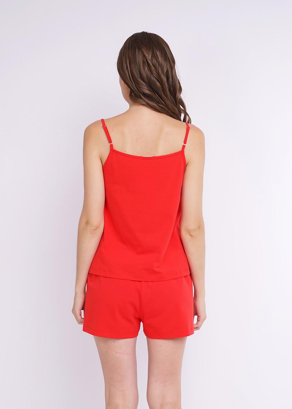 Комплект из майки и шорт из трикотажного полотна. Майка на регулируемых брителях, к низу чуть расширена. По переду кружево. Спереди металлический декор. Шорты с поясом на резинке, по бокам вставка из кружева.