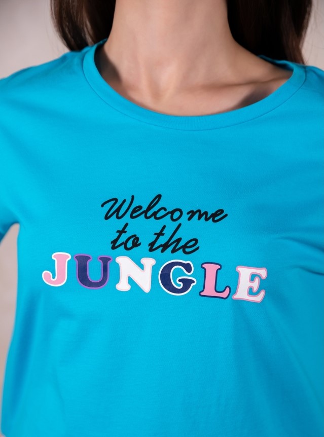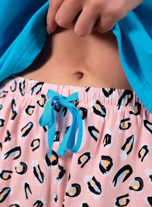 Домашняя пижама от торговой марки Индефини. В комплекте футболка и шорты. Футболка из хлопка, синего цвета, с принтом-надписями, с короткими рукавами, укороченная, прямая, свободного кроя. Шорты из хлопка, розового цвета, с анималистичным принтом, с обрамлением, на мягкой резинке, с регулирующим шнурком.