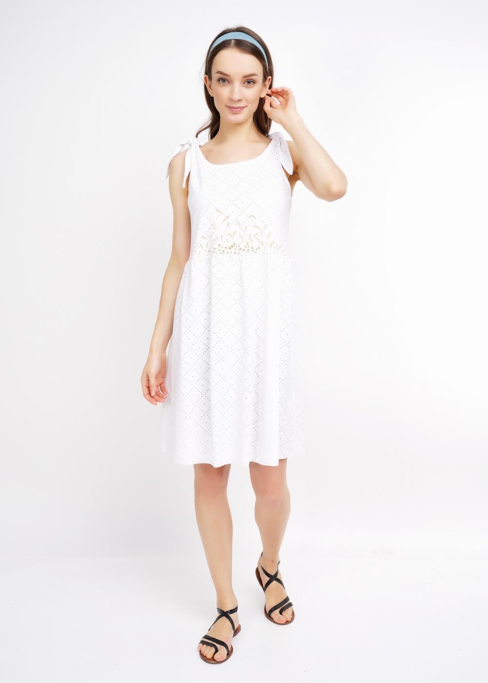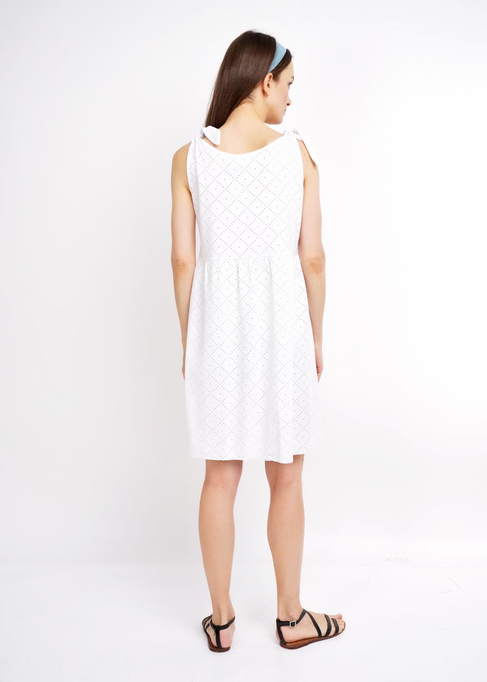 Сарафан А-силуэта из полотна "деворе". Модель имеет рез под грудью, углубленный вырез по спинке и брители с декоративными завязками.