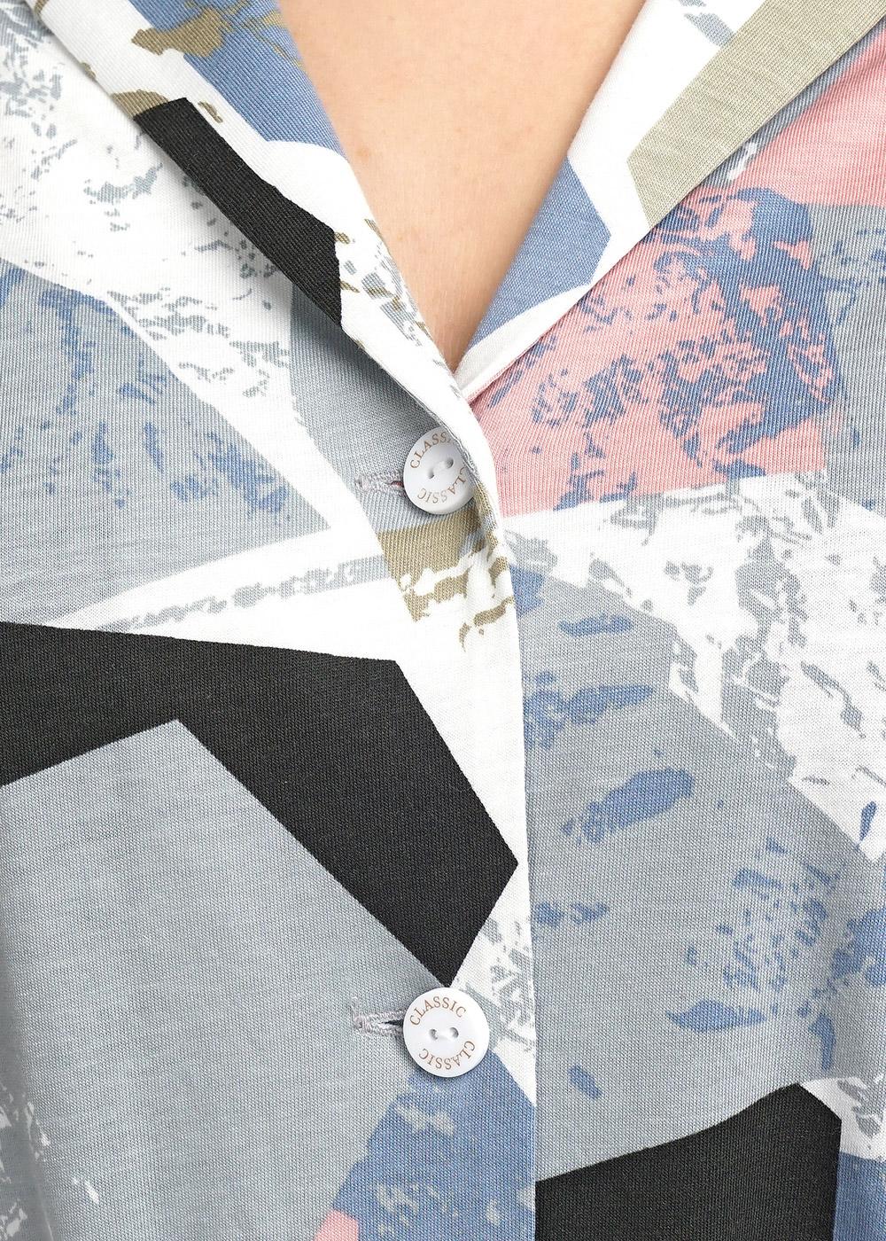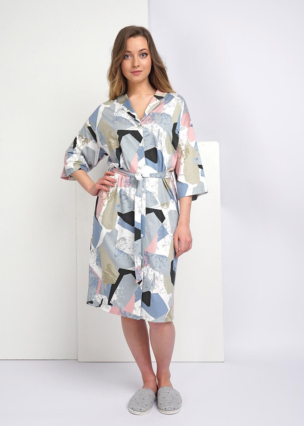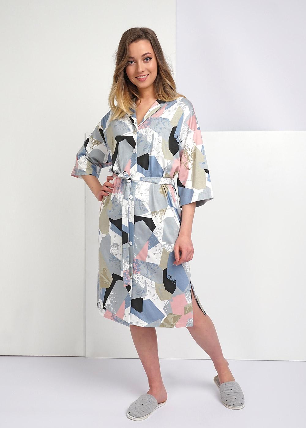 Платье-рубашка из трикотажного полотна с отложным воротником без стойки с лацканом. Спущенная линия плеча. Рукава чуть ниже локтя, по бокам разрезы. Пояс из полотна со шлевками.