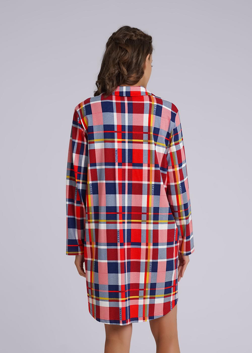 Платье-рубашка для дома из 100% хлопка с карбоном. Длинный рукав со спущенной линией плеча. Отложной воротник с лацканами. Застежка на пуговицы. В боковых швах карманы. На груди слева небольшой декоративный карман и жаккардовая нашивка.