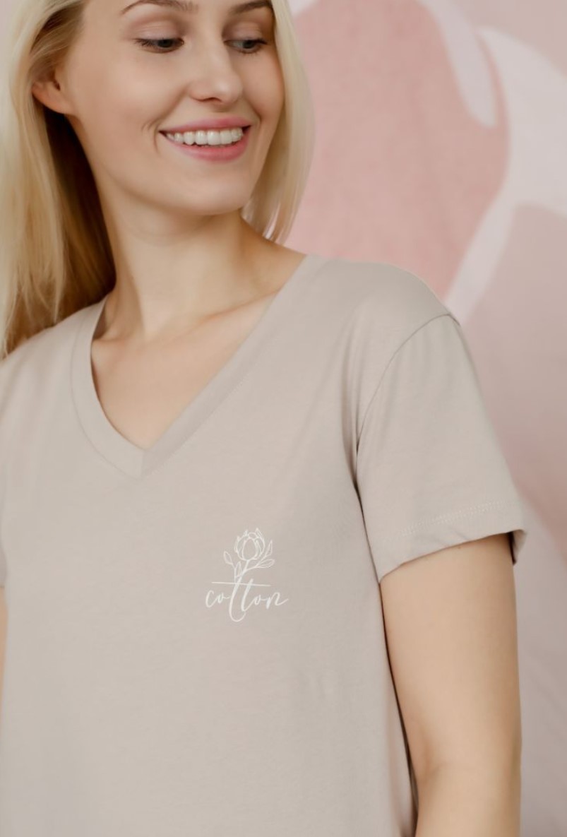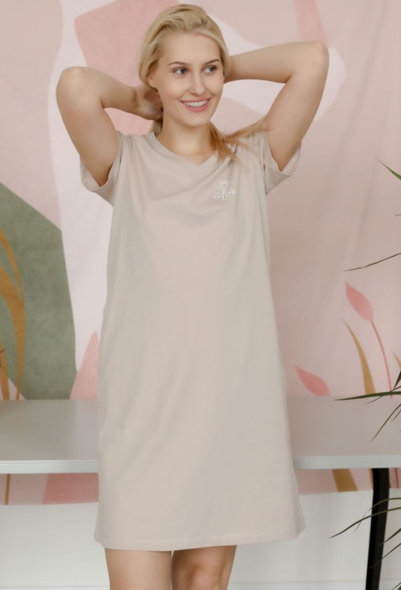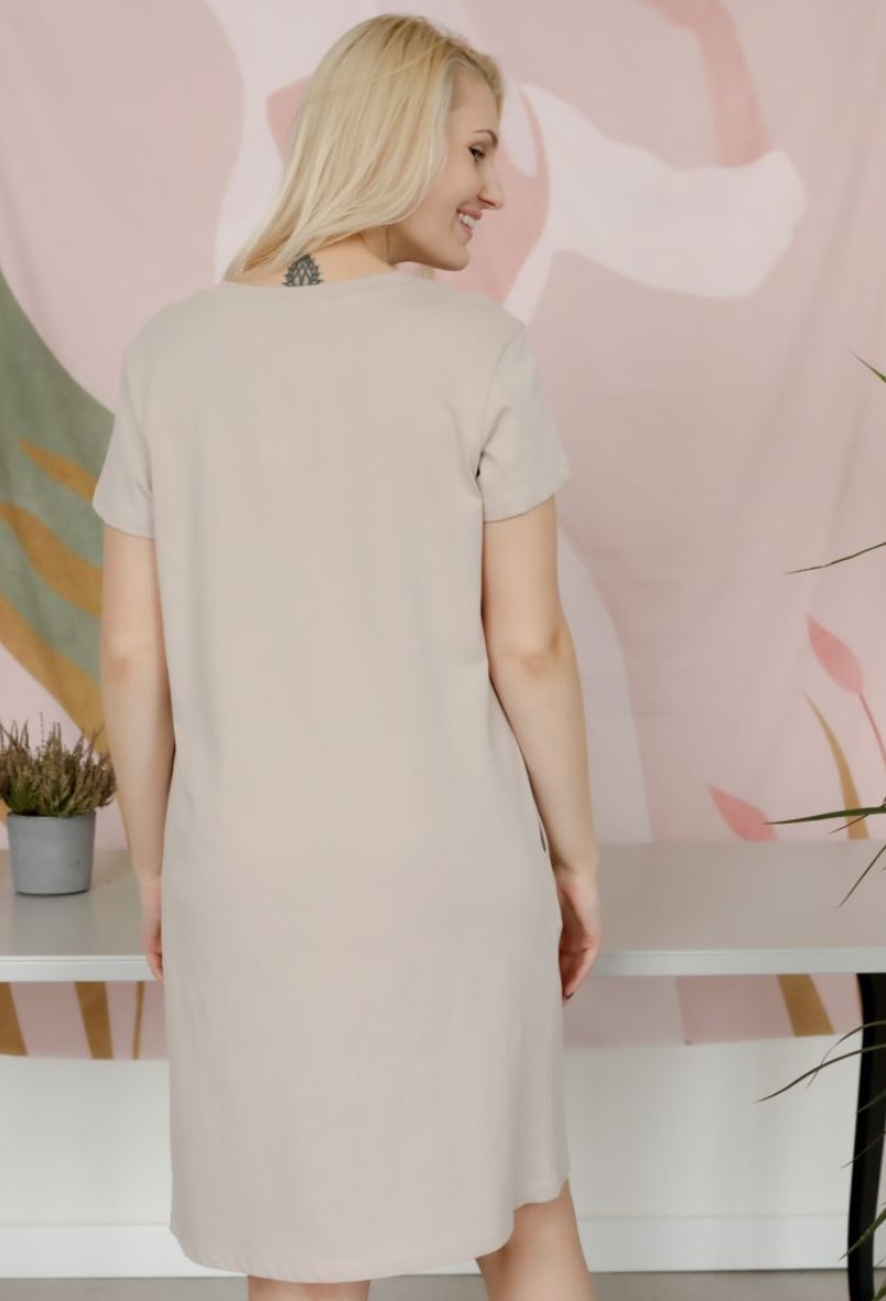 Классическое платье свободного прилегания. Рукав короткий. V-образный вырез горловины обработан бейкой в тон основного полотна.