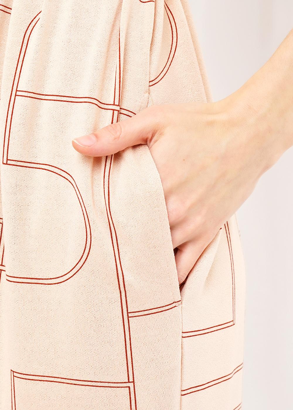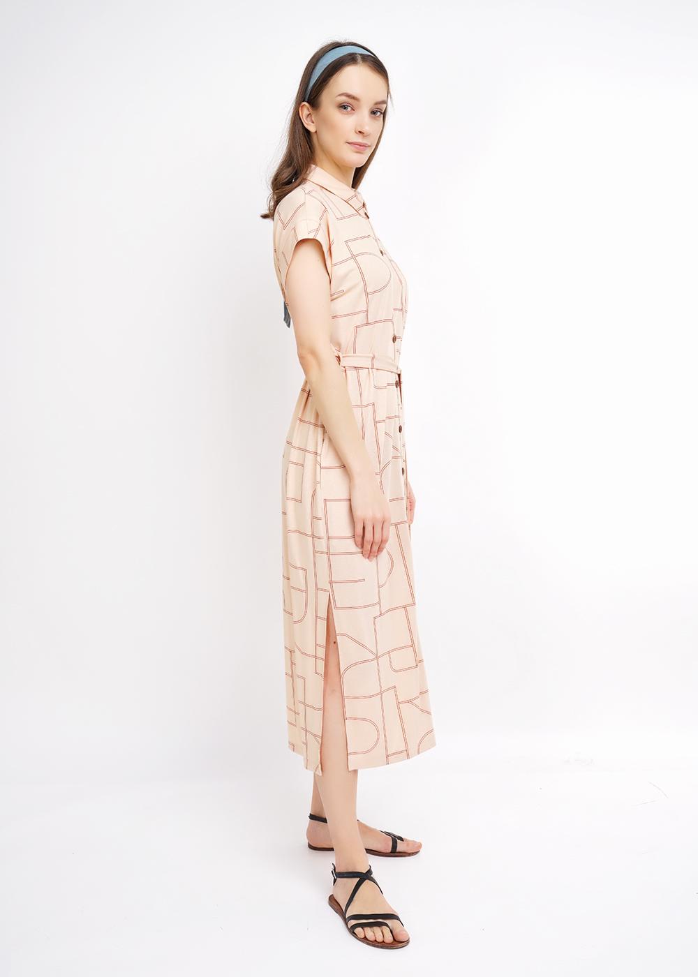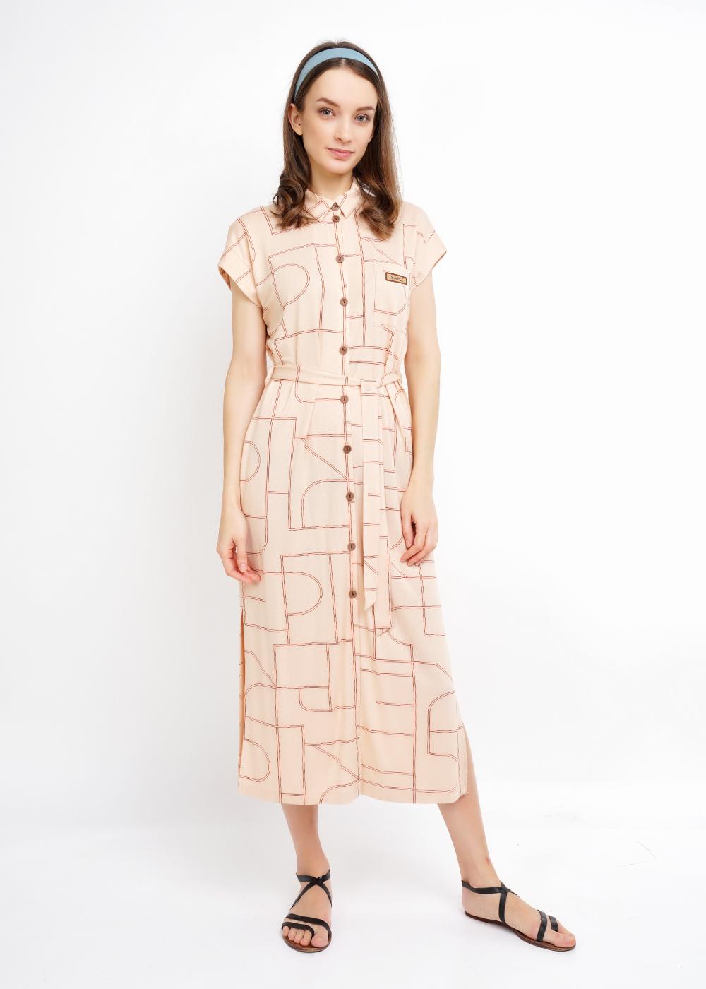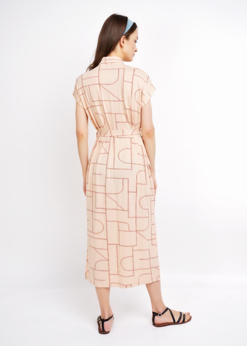 Удлиненное платье в набивку из креп вискозы. Спущенный рукав на манжете. Воротник отложной со стойкой. Спереди накладной карман с кожаной нашивкой. Пояс на двух шлёвках. По боковому шву разрезы. Карманы в боковых швах. Застежка на планку с пуговицами.