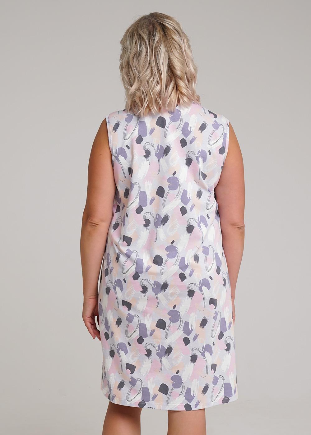 Сорочка ночная для дома без рукава из хлопкового трикотажного полотна. V-образный вырез горловины декорирован металлической нашивкой. Кокетки по переду дублируются кружевный полотном.