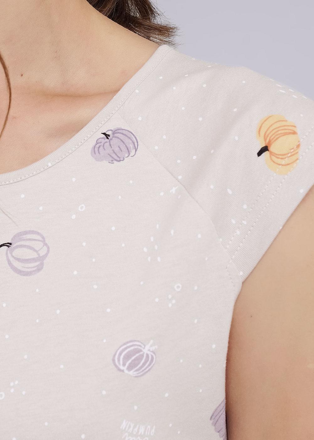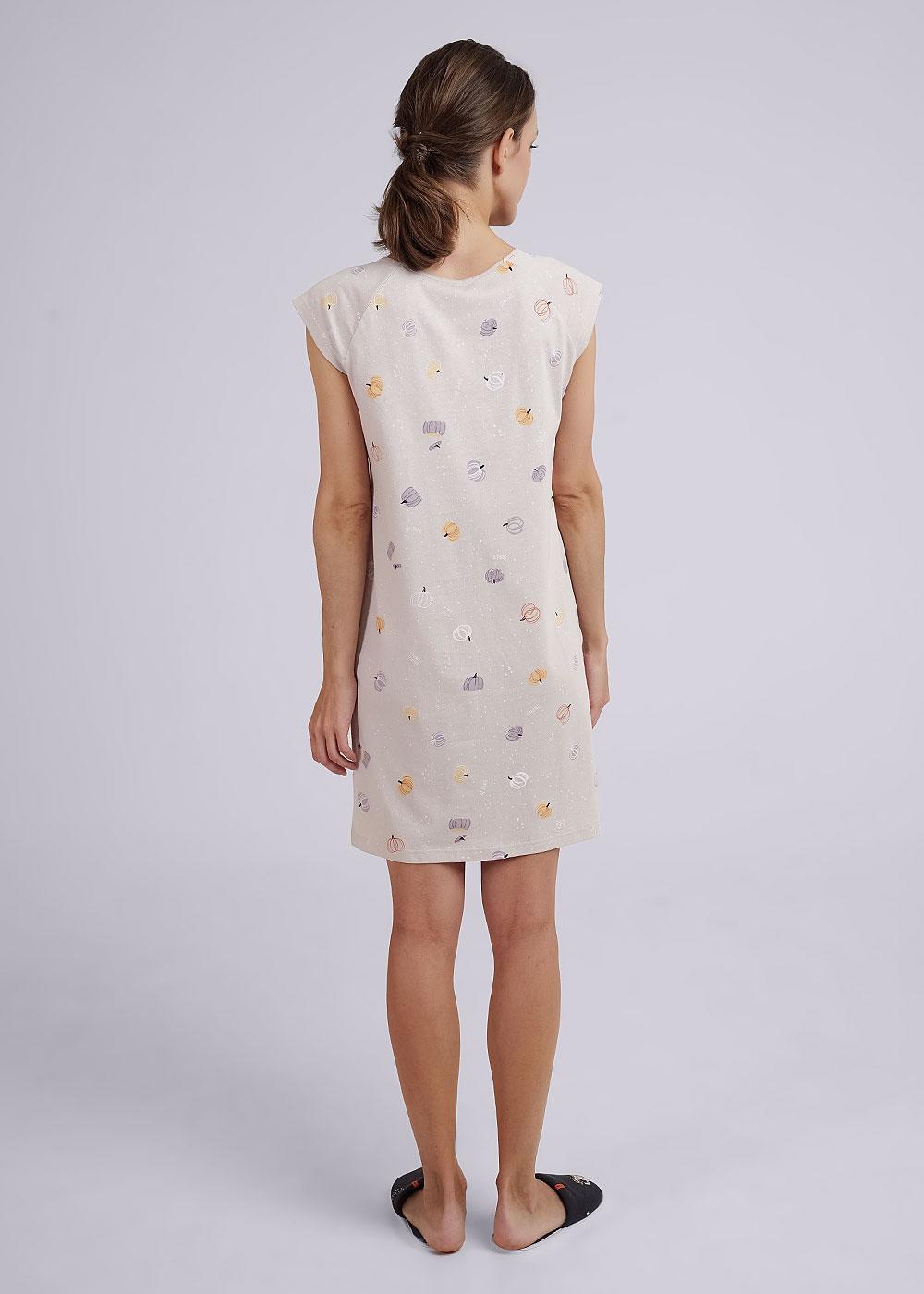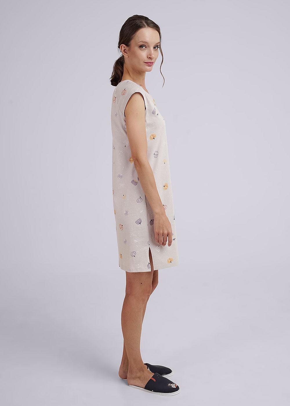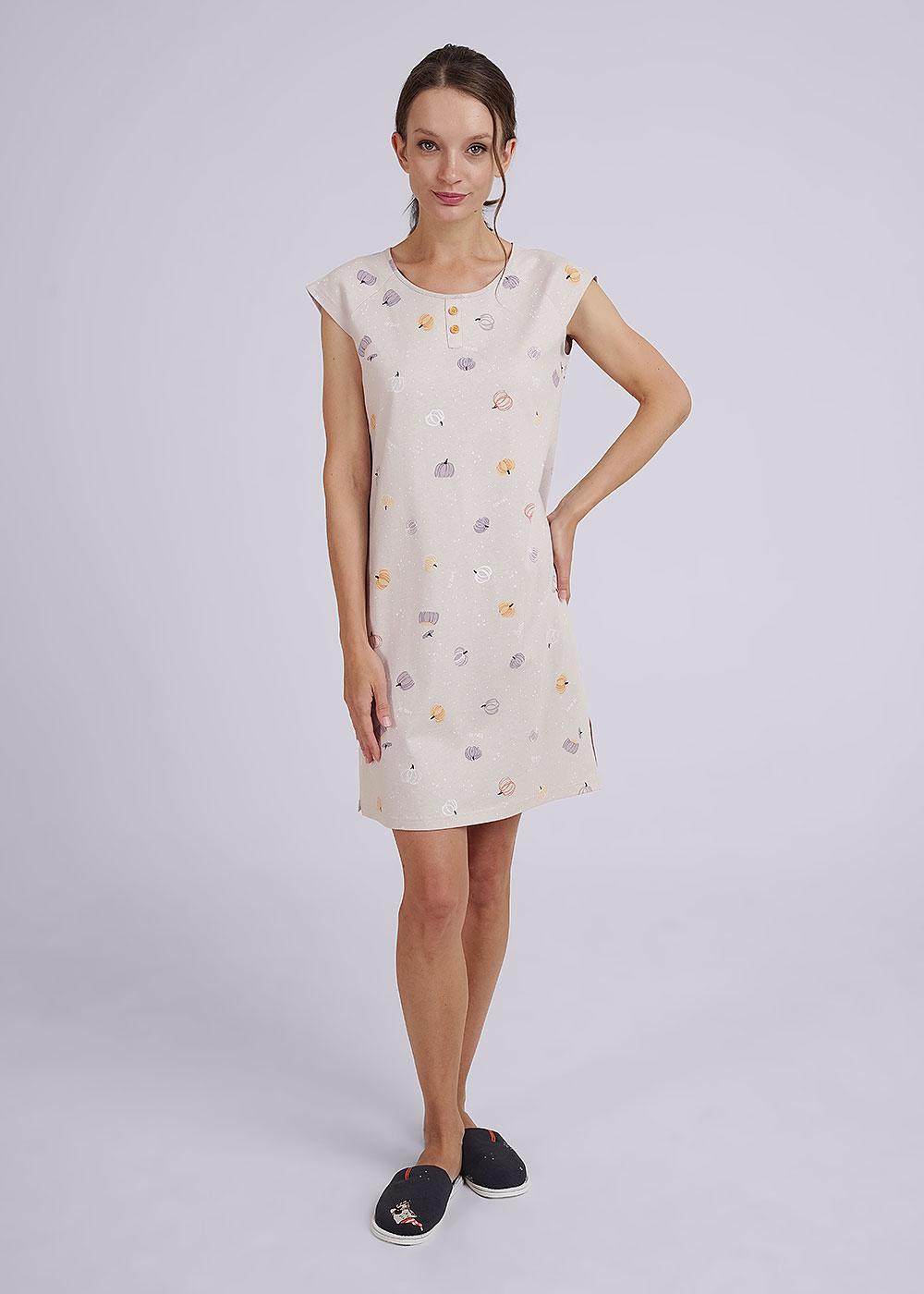 Сорочка ночная из хлопкового трикотажного полотна. Округлая горловина с окантовкой, спереди планка с пуговицами. Короткий рукав реглан. Внизу боковые разрезы.
