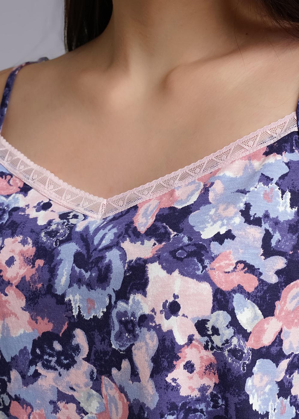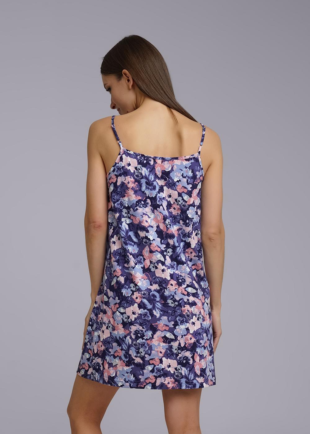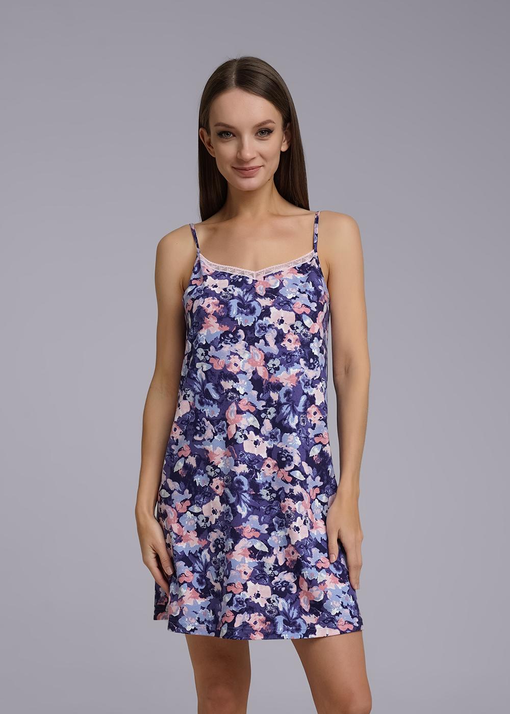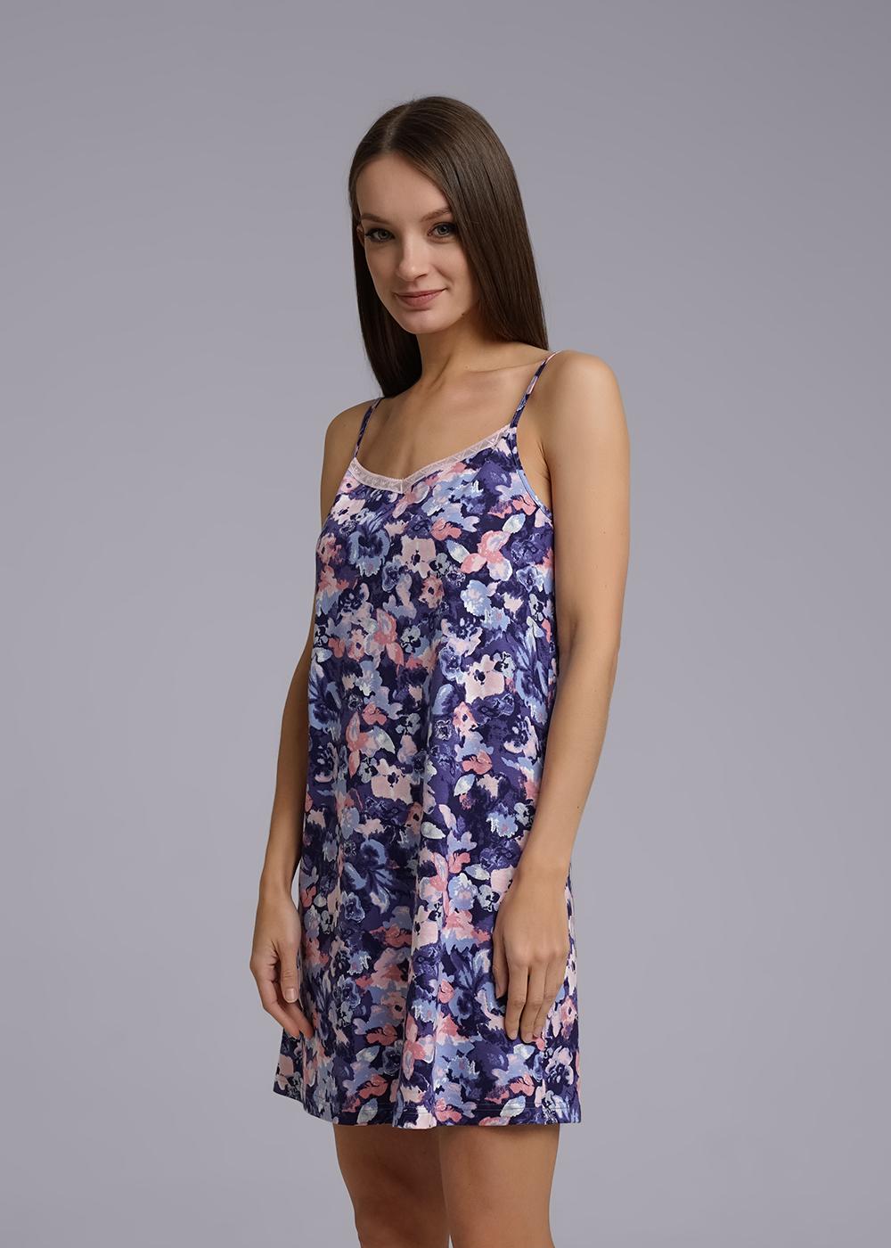 Сорочка ночная на узких бретелях с регулировкой из трикотажного полотна с хлопком и модалом в составе. V- образный вырез горловины декорирован узким кружевом.