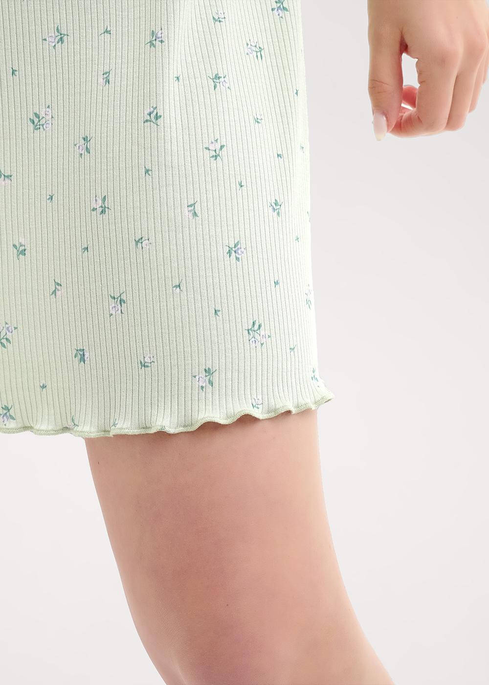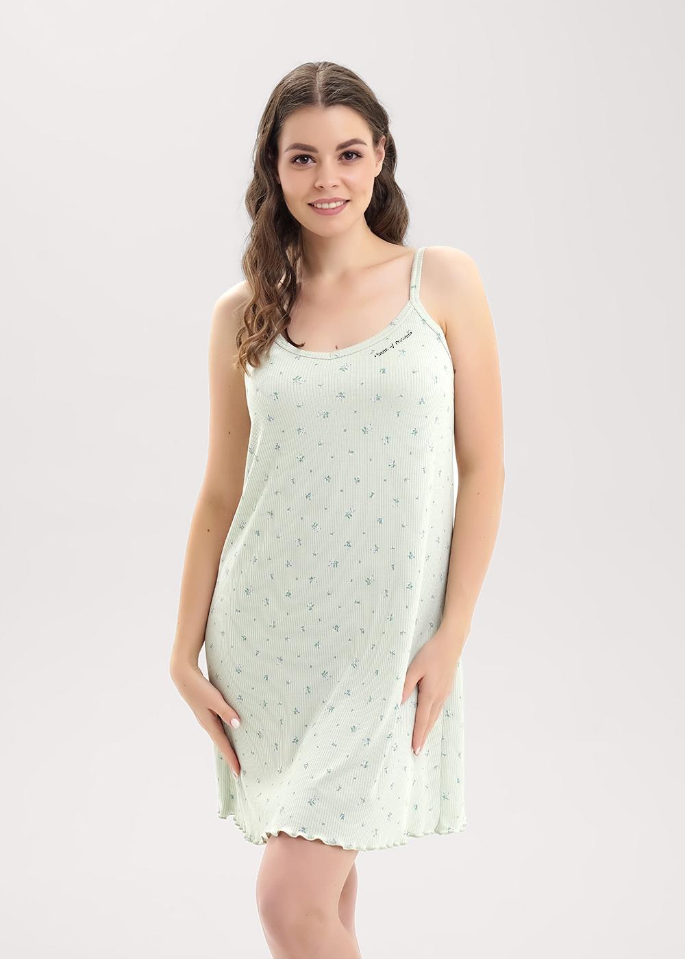 Сорочка ночная женская А-образного силуэта из эластичного полотна кашкорсе с вискозой в составе. Длиной чуть ниже колена, на узких бретелях. По горловине и пройме окантовка. На детали переда принт. По низу изделия мелкий оверлок.