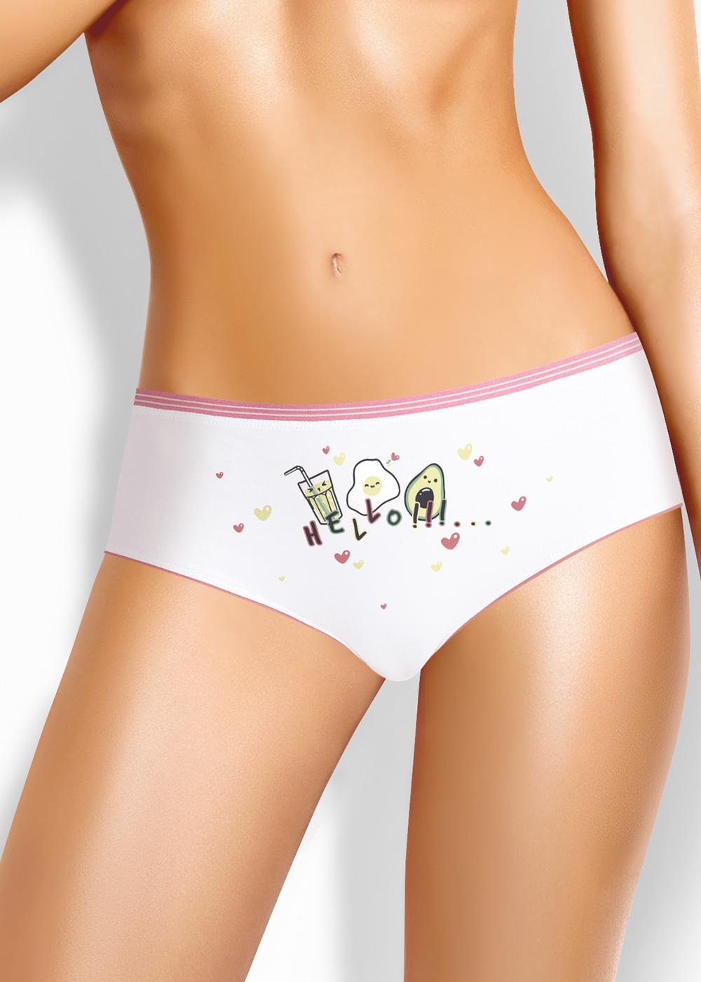 Трусы бикини комфортной посадки из хлопкового полотна с добавлением эластана. По талии окантовка из резинки, по ножке резинка кантом. Завершает дизайн принт на детали переда.