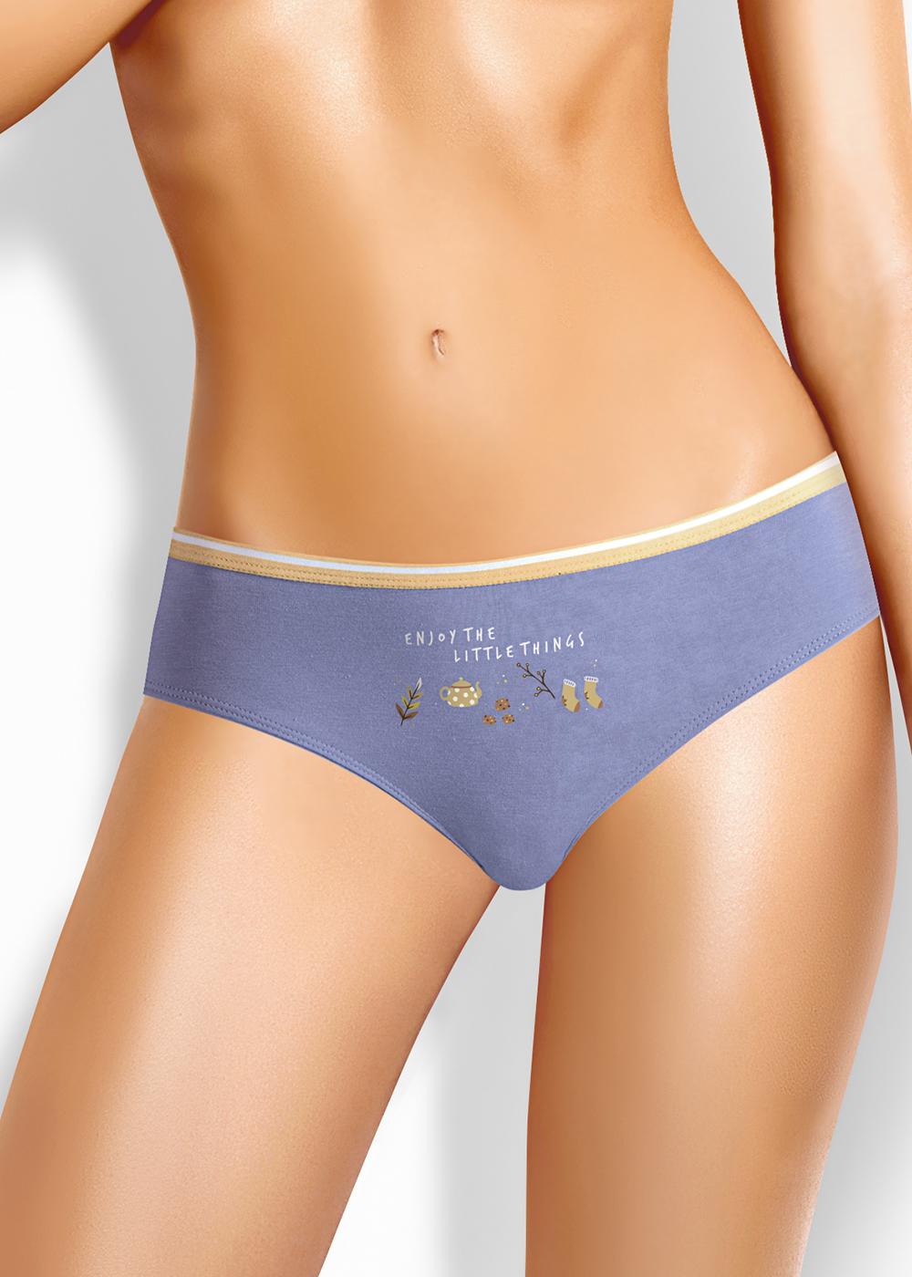 Трусы бикини из хлопкового полотна с добавлением эластана комфортной посадки. По талии резинка. По ножке резинка кантом. Завершает дизайн принт.