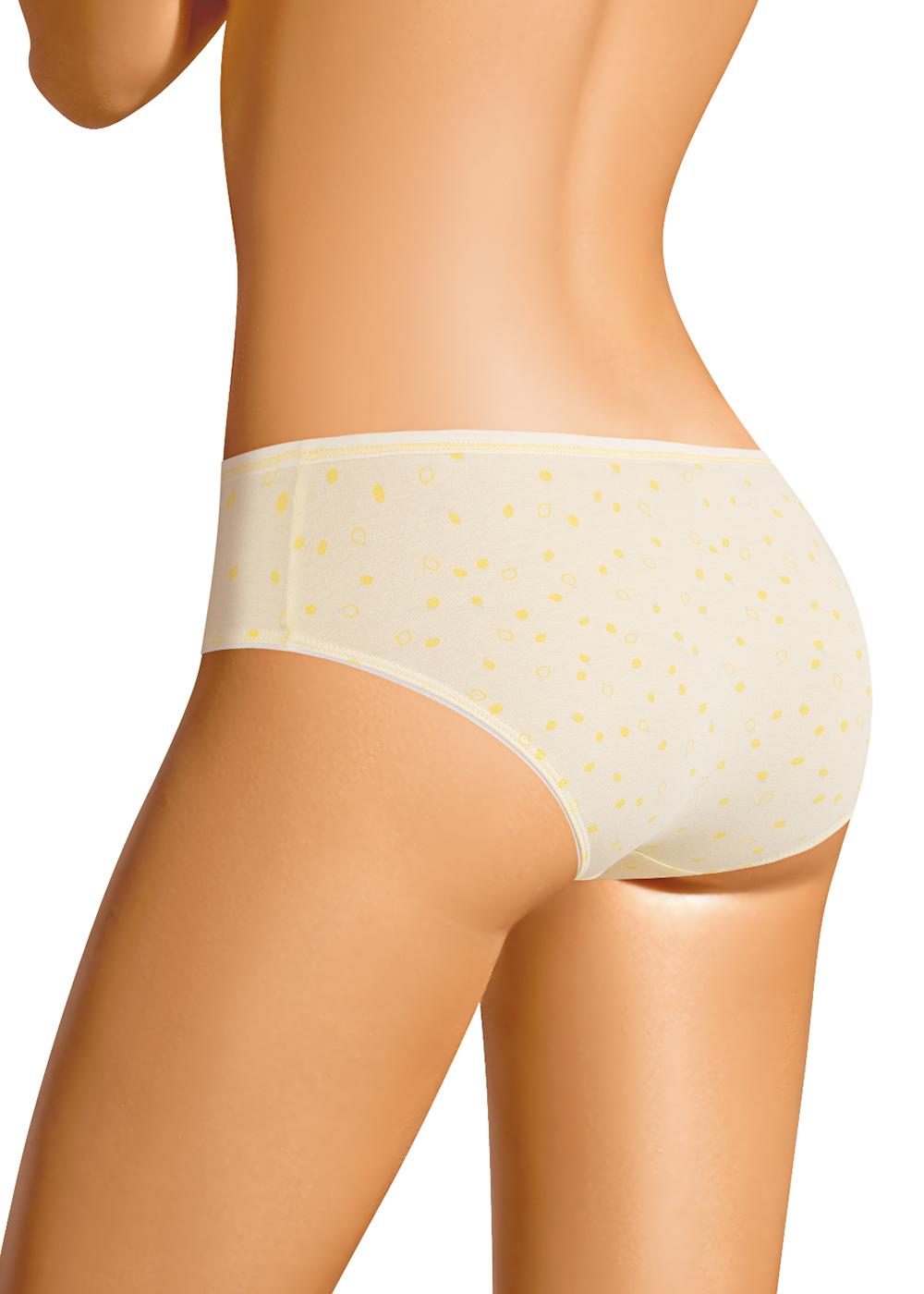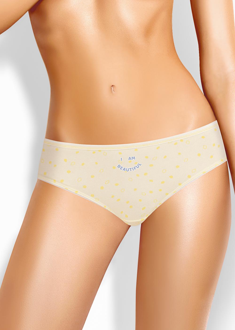 Трусы бикини женские из эластичного хлопкового полотна. Обработка краев по талии окантовочная резинка с застилом, по ноге - полуокантовка. По переду принт.