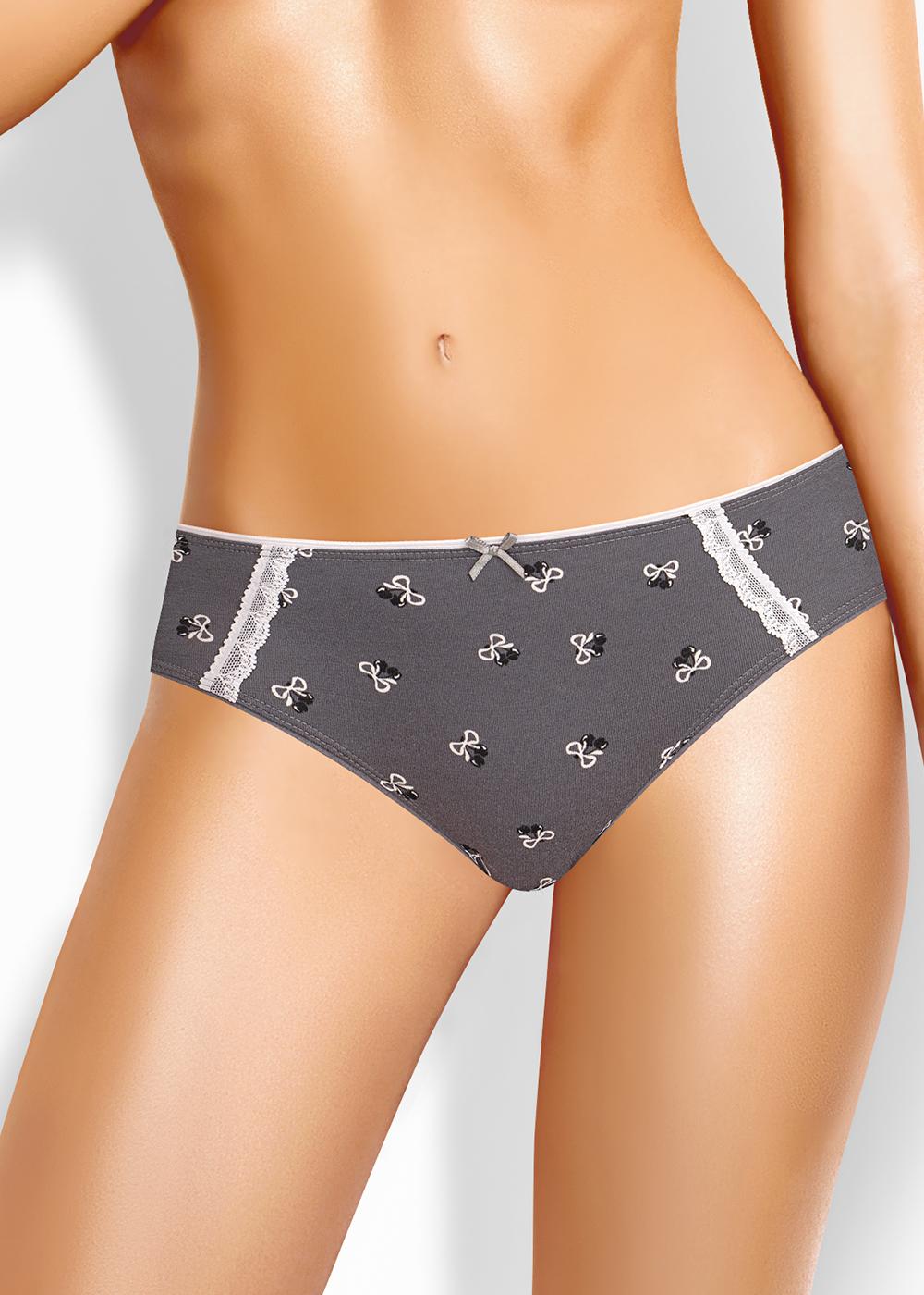 Трусы бикини женские из эластичного хлопкового полотна. Обработка краев по талии и ноге - резинка с кантом. По переду вставки из узкого кружева, атласный бант.