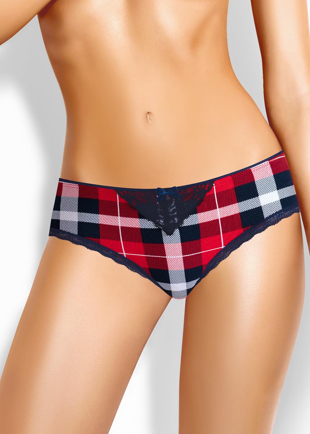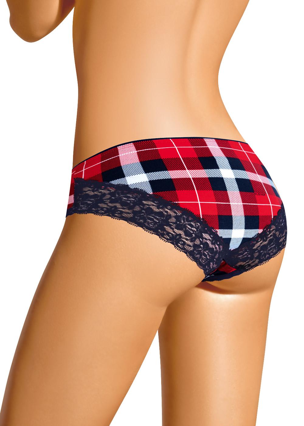 Трусы "бикини" выполнены из трикотажного полотна в клетку, где в поддержку набивки добавлено контрастное кружево по переду и по спинке. По талии резинка-кант.