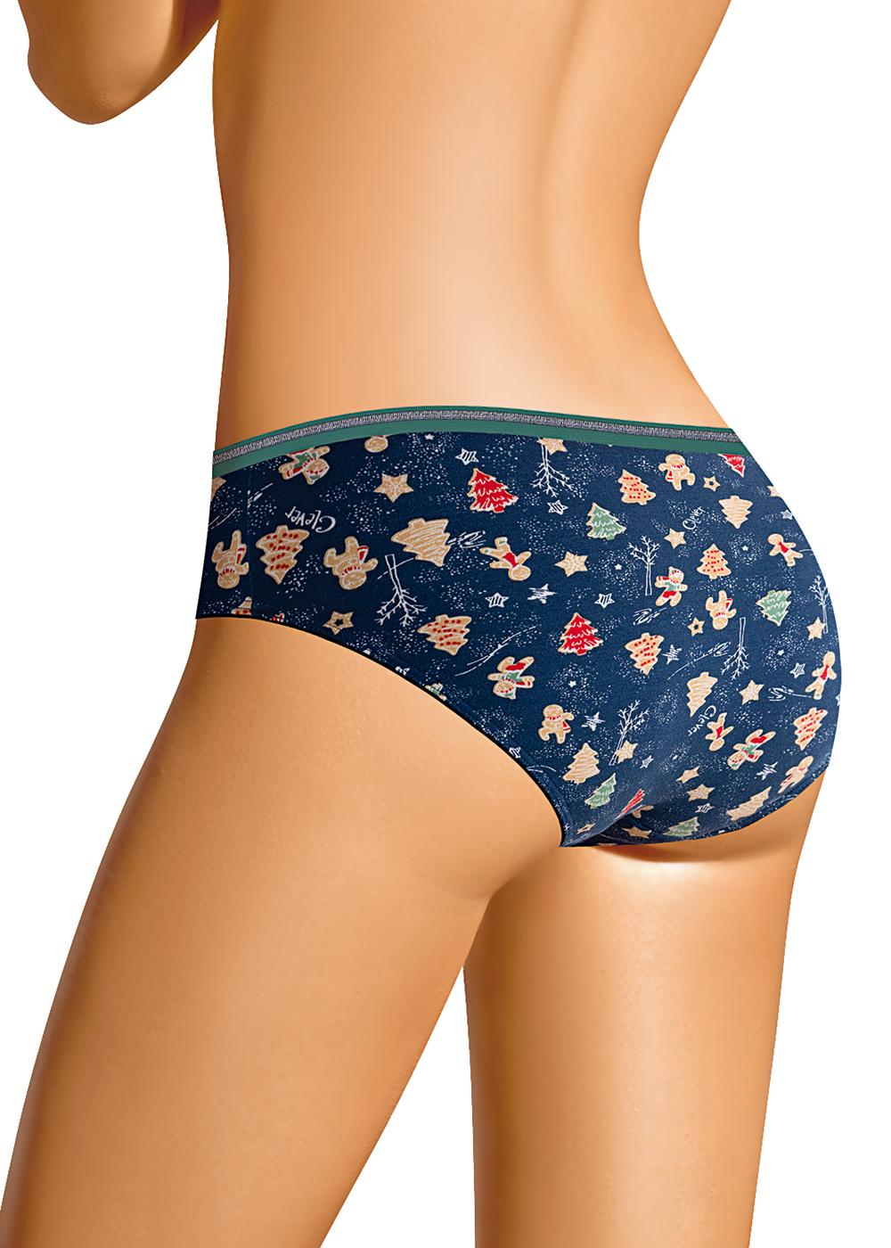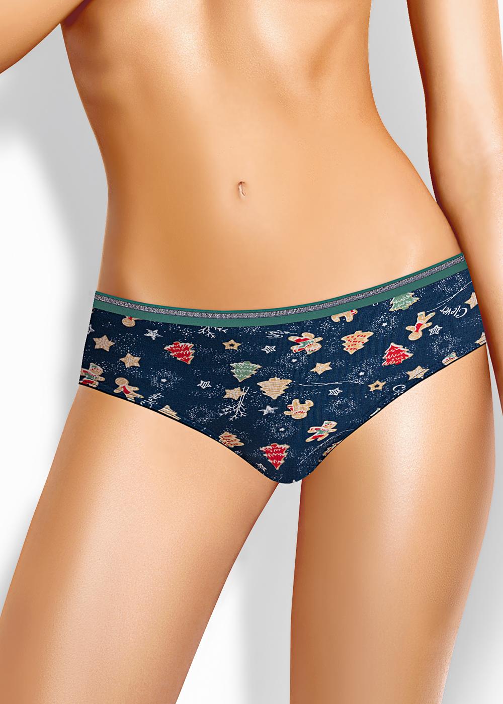 Трусы-бикини женские из эластичного хлопкового полотна. Обработка краев по талии - широкая окантовка с люрексом, по ножке - узкая окантовка.
