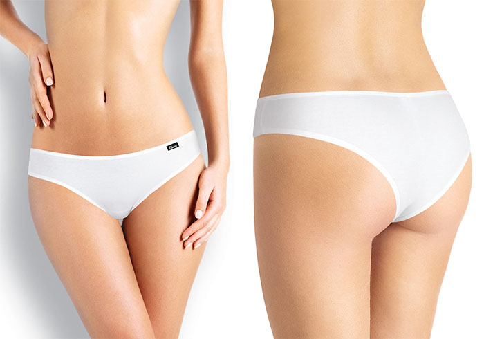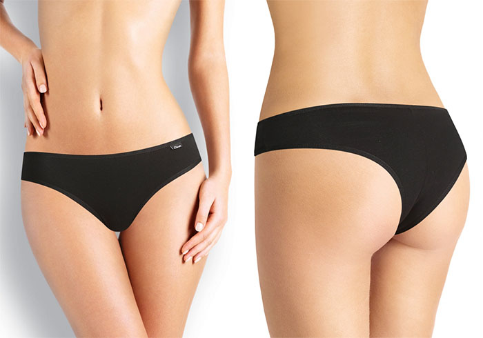 Однотонные трусики - бразилиано, оформлены фирменным логотипом.