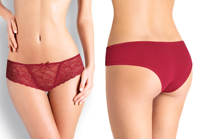 Женские трусы, модель бразилиано из трикотажного хлопка и мягкого, эластичного кружева. На поясе узкая резинка и декоративный бантик.