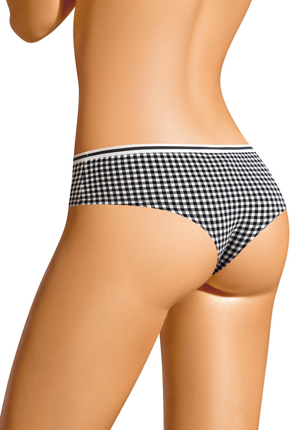 Трусы бразильяна из хлопкового полотна с добавлением эластана комфортной посадки. По талии жаккардовая резинка и декоративная пуговица.