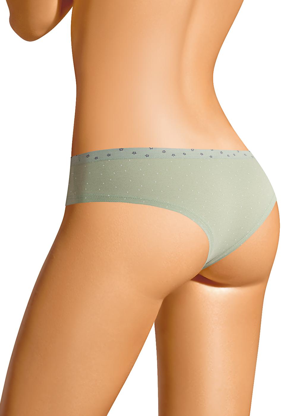 Трусы бразилиана женские из эластичного хлопкового полотна. Обработка краев по талии - окантовочная резинка, по ноге - подгибка. По переду кружевная вставка,пуговица.