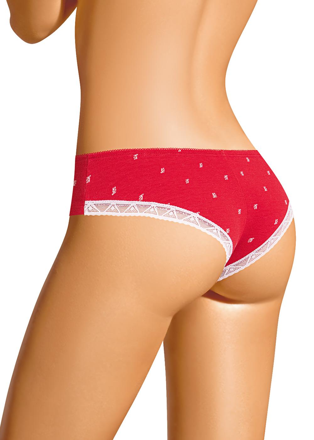 Трусы бразилиана женские из эластичного хлопкового полотна. Обработка краев по талии - ажурная резинка, по ноге спереди - подгибка, по спинке - узкое кружево. Сзади шов. По переду атласный бант.