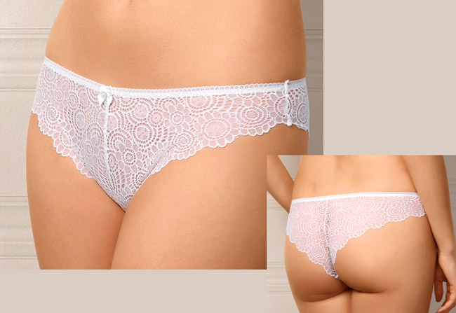 Романтичные женские трусики бразилиано. Имеют среднюю посадку, отделанную ажурной резинкой и украшенную атласным бантиком. Трусики слегка прозрачные, полностью выполнены из цветочного кружева. Модель идеально облегает женскую фигуру.