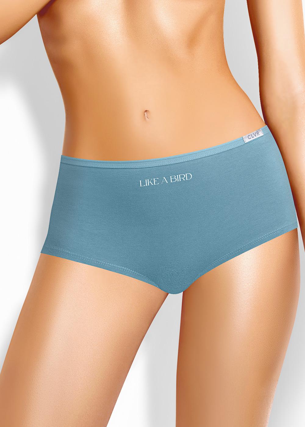 Трусы шорты женские из эластичного хлопкового полотна. Обработка краев по талии окантовочная резинка, по ноге - подгибка. По переду нашивка и принт.
