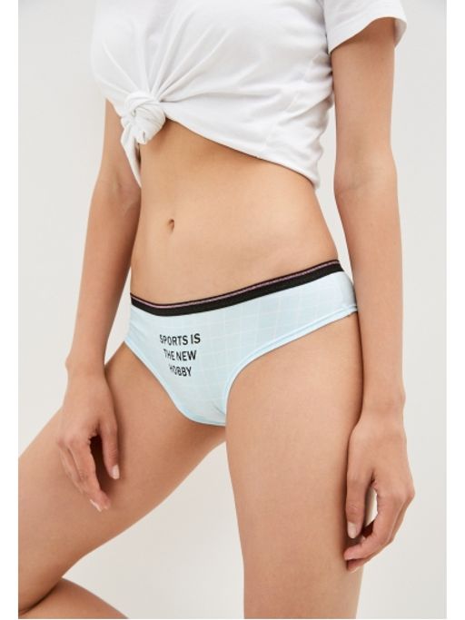 Женские трусы от торговой марки Индефини. Трусы-шорты из хлопка, голубого цвета в клетку и с принтом-надписью, на мягкой резинке.