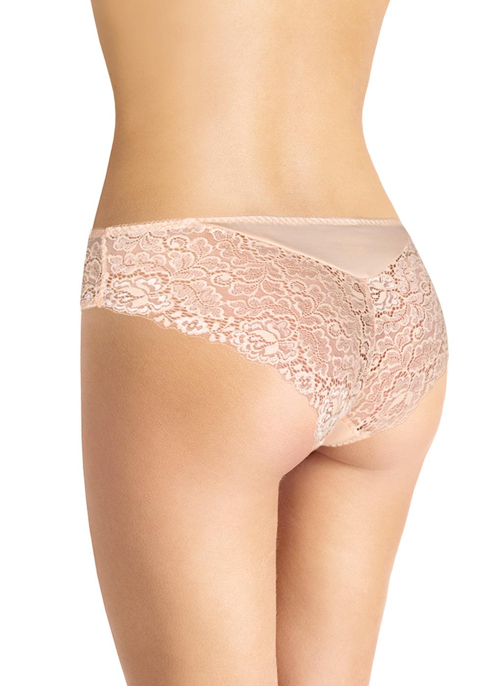 Классическая модель комфортной посадки.Изделие комбинированное: по спинке - кружевное полотно с треугольной трикотажной вставкой,по переду - однотонный трикотаж. Боковой шов в изделии переведен вперед. По ножкам спереди и по талии - резинка с фестоном. На детали переда в центре расположен небольшой атласный бант.