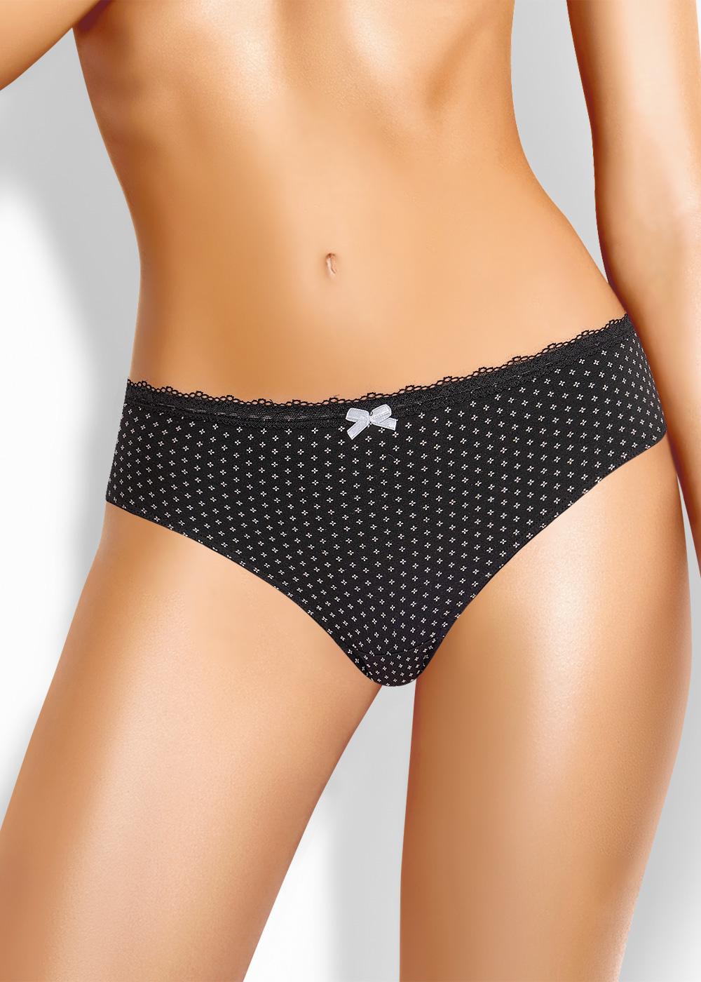 Трусы-слипы женские из эластичного хлопкового полотна. Обработка краев по талии - кружево, по ноге - окантовка. По переду бант.
