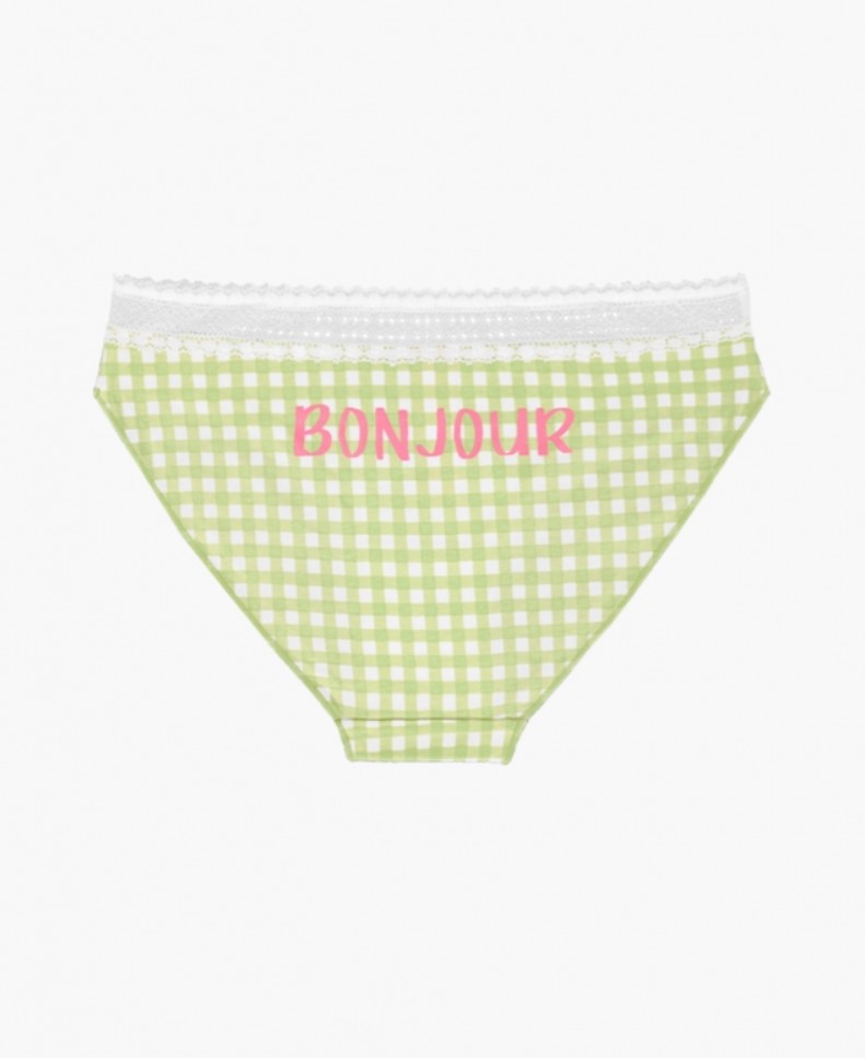 Женские трусы от торговой марки Индефини. Трусы-слипы из хлопка, бело-зеленого цвета, с принтом в клетку, с принтом сзади, с кружевным обрамлением, на мягкой резинке, средней посадки.