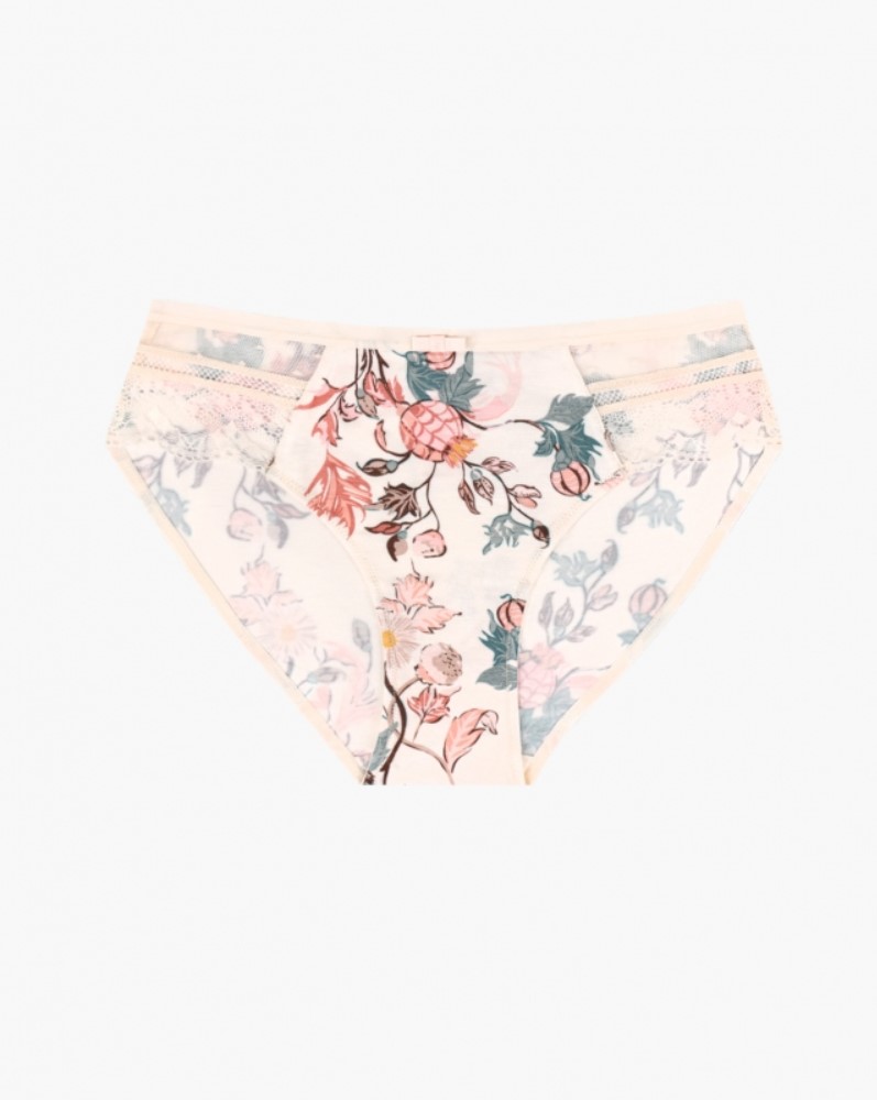 Женские трусы от торговой марки Индефини. Трусы-слипы из бамбука, светло-бежевого цвета, с цветочным принтом, с кружевными вставками спереди, на мягкой резинке, средней посадки.