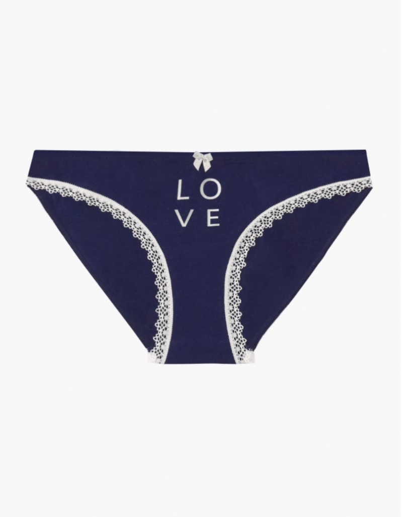 Женские трусы от торговой марки Индефини. Трусы-слипы из хлопка, синего цвета, с принтом-надписью, с кружевным обрамлением, на мягкой резинке, средней посадки.