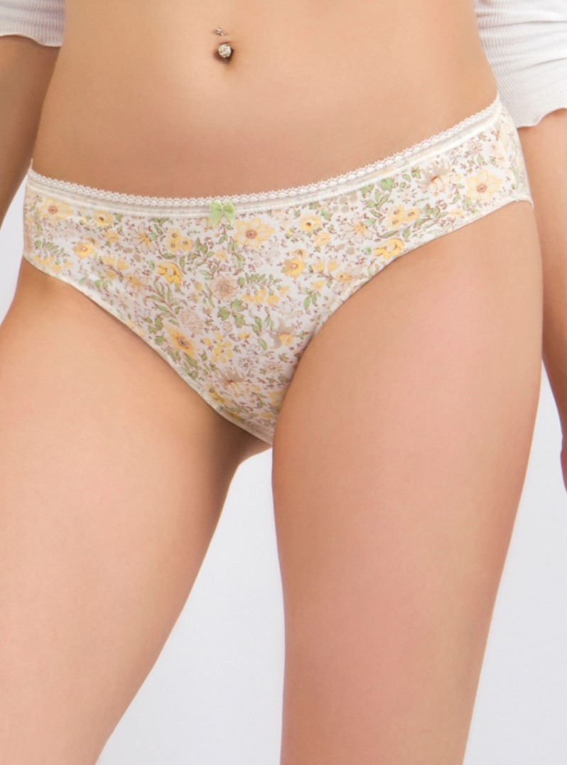 Женские трусы от торговой марки Индефини. Трусы-слипы из хлопка, желтого цвета, с цветочным принтом, с кружевным обрамлением, на мягкой резинке, средней посадки.