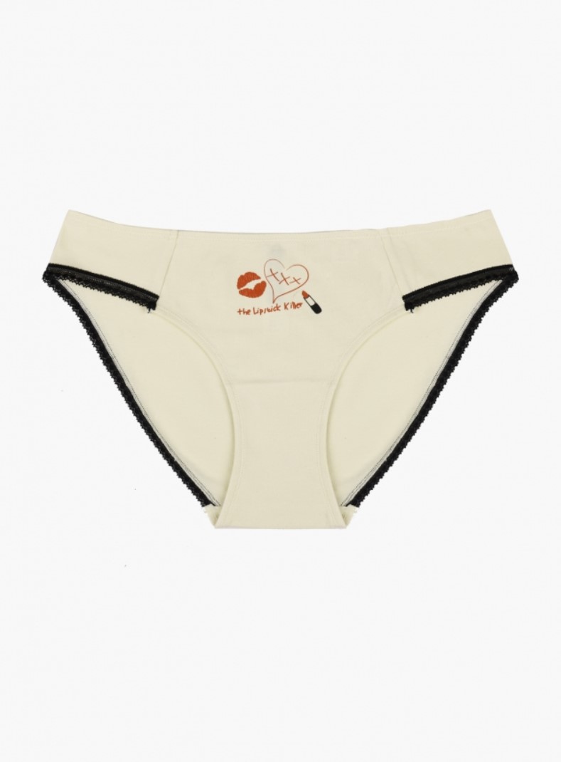Женские трусы от торговой марки Индефини. Трусы-слипы из хлопка, бежевого цвета, с принтом и надписями, с кружевным обрамлением, на мягкой резинке.