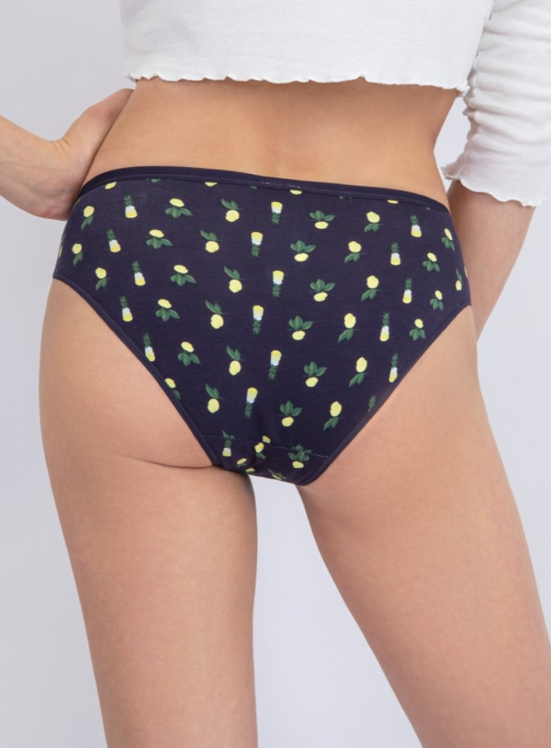 Женские трусы от торговой марки Индефини. Трусы-слипы из хлопка, синего цвета, с цветочным принтом, с принтом-надписями, на мягкой резинке, средней посадки.