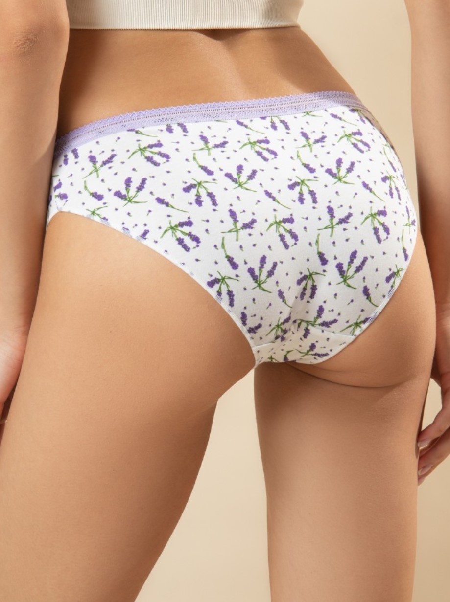 Женские трусы-слипы из хлопкового материала отлично пропускают воздух к телу. Благодаря мягкой кружевной резинке трусы идеально сидят на коже и не вызывают дискомфорта. Средняя посадка делает изделие универсальным и подходящим для повседневного использования. Данная модель украшена принтом «сирень».
