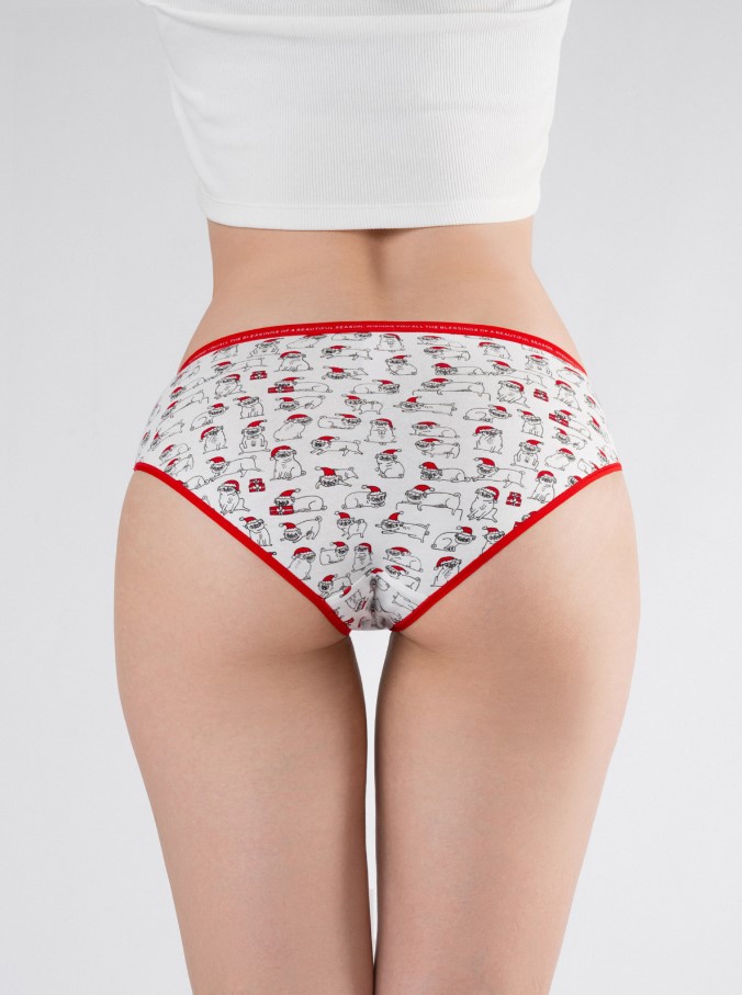 Трусы слипы женские приятные в носке, мягкие и гладкие на ощупь благодаря наличию в составе хлопкового материала. Мягкая резинка на талии надежно фиксирует трусы на теле, что не позволит им сползать при использовании. Принт с изображением новогодних щенков добавляет игривую нотку и создаёт праздничное настроение, делая трусы комфортным и стильным элементом бельевого гардероба. Трусы слипы — удачное сочетание уюта, качества и новогоднего настроения, которое радует в любой зимний день.